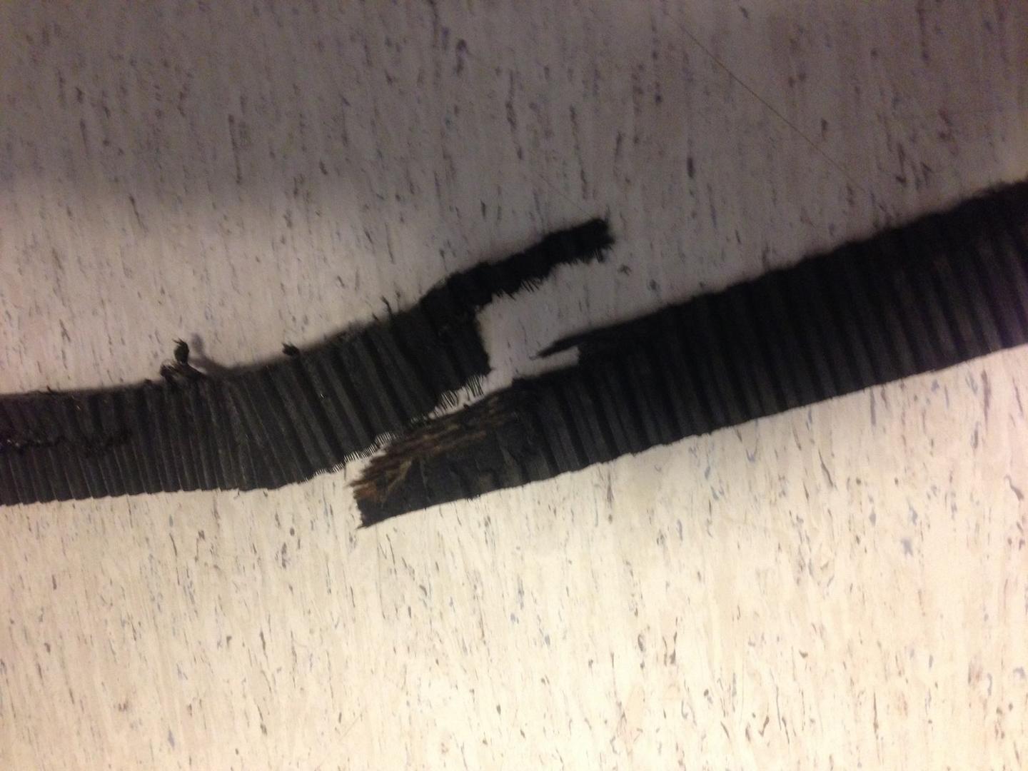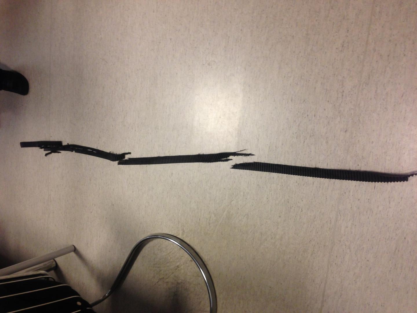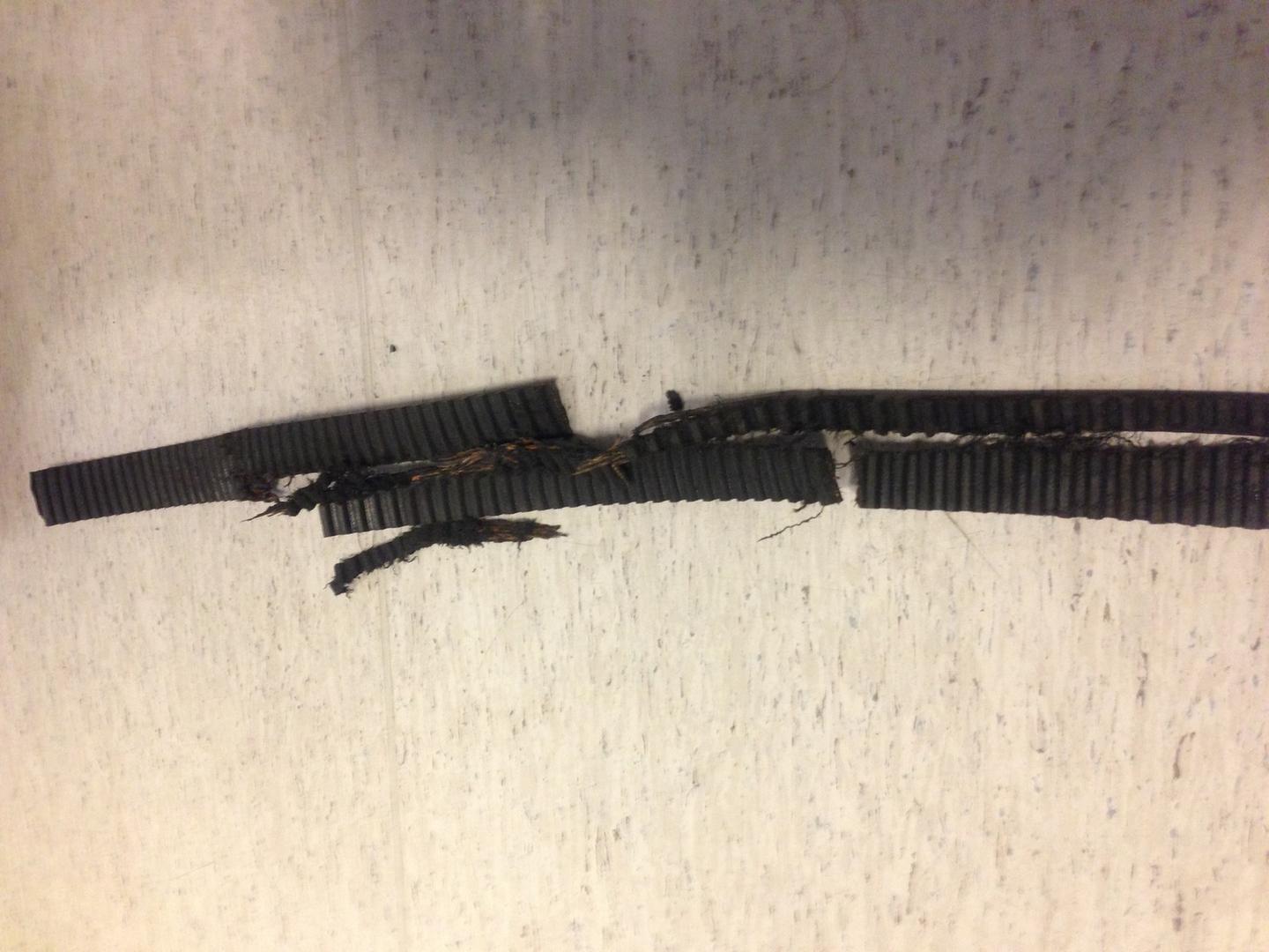Kuvat valehtelee enemmän kuin tuhat sanaa, pesin quickleenillä osat ennen valokuvien ottamista kun olivat niin paskaisia. Hihnassa ei näy hankausjälkiä, niitä etsin itsekin juuri sillä silmällä että olisiko pitkällä aikavälillä kulunut poikki. Hihnasta löytyi kuitenkin täysin virheettömän näköistä pätkää joku metrin verran. Loppu on enemmän tai vähemmän riekaleina. Katkeamiskohtaa ei minun järjelläni saanut kovin helposti selvitettyä. Koitan vielä saada vaikka hihnan rääppeistä raadille pari kuvaa, tänään osat nimittäin lähtevät eteenpäin.