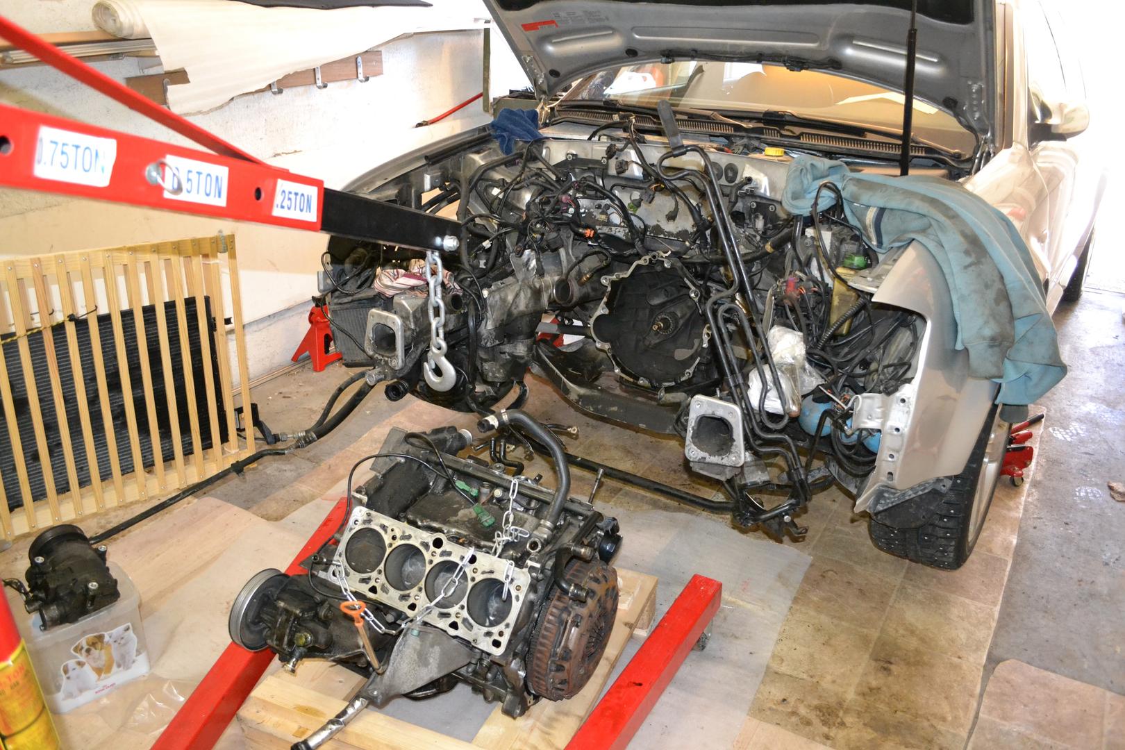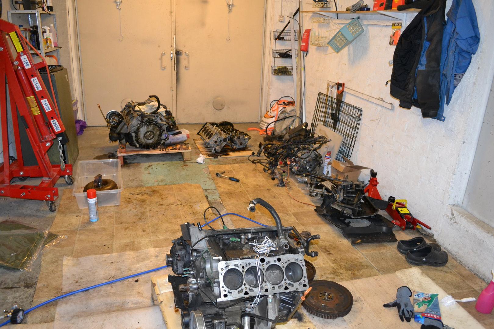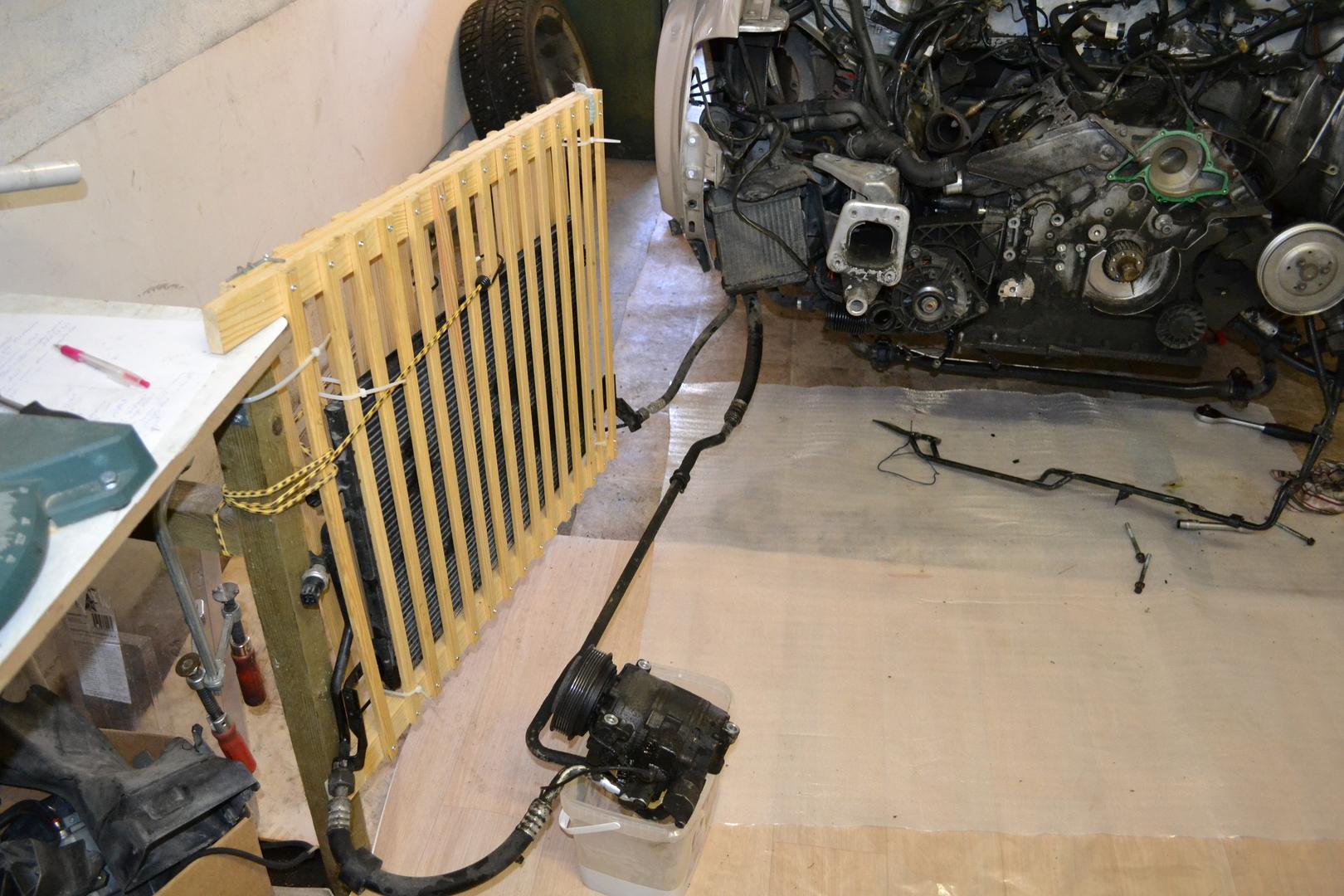 Vanhaa konetta on paikallaan enää moottorilohko sisuskaluineen. Apulaitteet on vielä kiinni enkä taida irroittaa kuin kompressorin. Aika hankalalta tuntuu jo etukäteen saada kaikki ne koneen takana olevat vesiletkut paikoilleen. Nyt sai suht iisisti auki kun ei ollut kansia ja imusarjaa edessä.