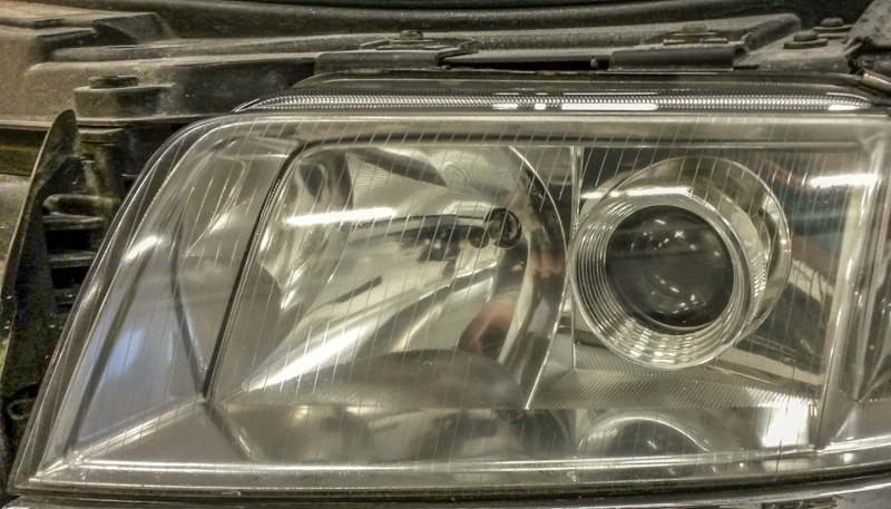 Laturirempan tein eilen ja samalla kun oli taas naama autosta irti niin läksin umpioita puunaamaan. Käytin kuumapuhaltimen kanssa tiivisteliimat auki ja pesin lasit sisäpuolelta. Projektoreissa ei oikeastaan ollut mitään putsattavaa mutta lasit ovat ulkoapäin aika kehnossa kunnossa. Sameat ja naarmuiset.