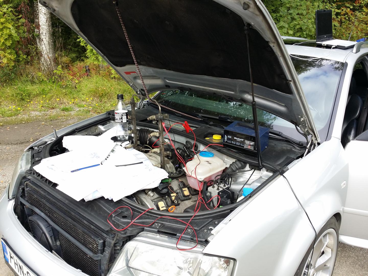 Irrotin vanhasta ylimääräisestä johtosarjasta yhden suuttimen liittimen ja laitoin toisen johdon akun plussaan, toisen painoin aina tarpeen mukaan maihin. Pumpun ohjasin niin että laitoin bensapumpun releen tilalle hyppylangan ja akun laturiin ettei pumpun tuotto ainakaan jänön puutteesta muutu kesken testien. Jostain syystä vakkomin output testi lopetti noin minuutin jälkeen eikä suostunut enää lähtemään uudestaan päälle, olisi varmaan vaatinut koneen käynnistämisen välissä mutta suutinrunko oli jo nostettu pois paikaltaan, siksi hyppylankaviritys.