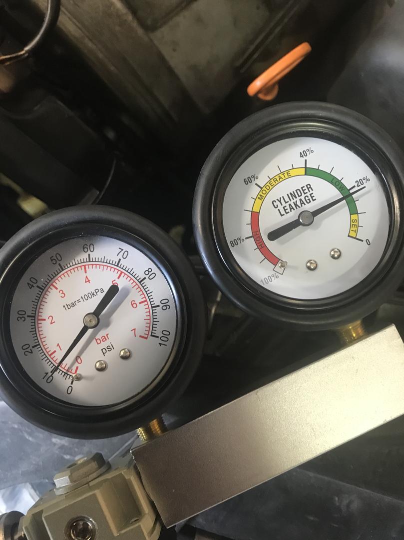Viime viikonloppuna päätin sitten ottaa nokat pöydälle ja tarkastaa välyksensäätimien kunnon josko äänelle joku lähde löytyisi. Nokat ja säätimet kaikinpuolin kunnossa. Siinä samalla kun nokat oli irti, kaverilta lainattu ohivuotomittari kiinni ja sieltähän 5 sylinteri näytti 8%. 6, 7 ja 8 reilut 30%. Katin korvausputki sekä imusarja irti eikä kummatkaan venttiilit vuotaneet. No eihän siinä auttanut kun kone nippuun. Jaon hierominen kohdilleen ja lämpimäksi käyttö. Pyörittelin jokaisen sylinterin puristustahtiin ja mittasin uudestaan.