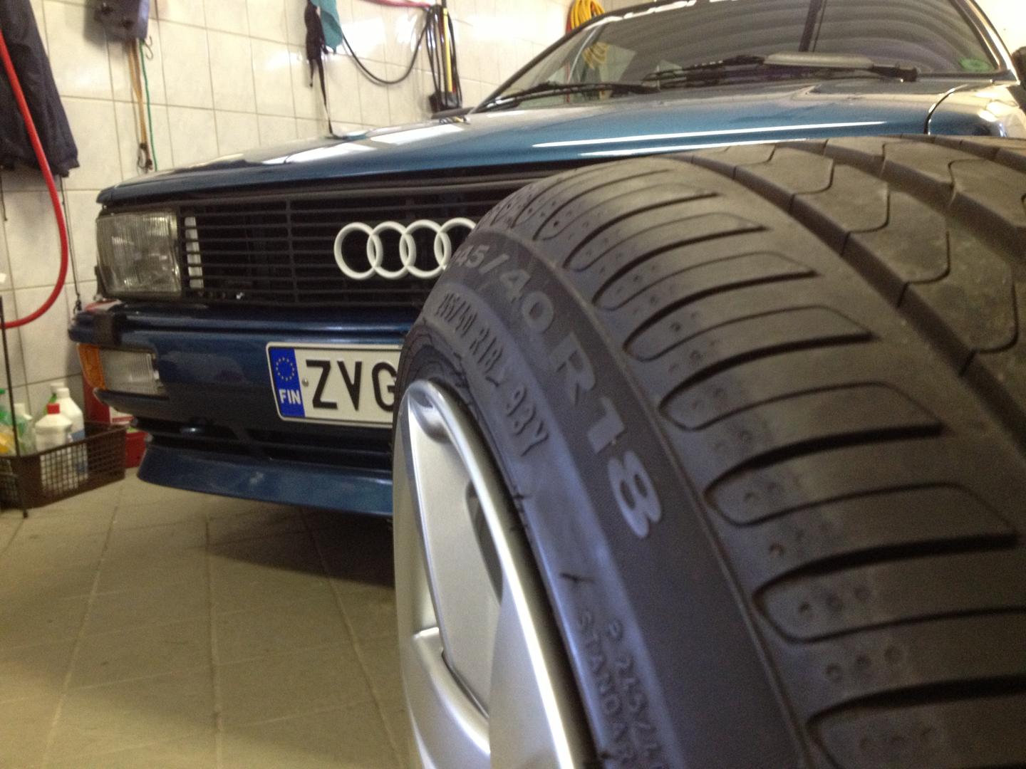 Sitä ennen piti suorittaa pois alta pitkään venynyt pyörien suuntaus. Nyt on kulmat kohdallaan. Kulmia säätäessä tosin löytyi uusi ongelma. Useammasta renkaasta valskasi ilmaa pihalle. Vika selvisi, kun käytin kaikki renkaat tarkastettavana rengasliikkeessä. Ilma karkasi renkaan ja vanteen saumasta. Tämä johtui siitä, kun vanteisiin syksyllä tehty värinvaihdoslakkakerros ei ollut tarpeeksi paksu sauman kohdalta. Lakka hilseili irti ja rengas ei ollut enää tiiviisti vannetta vasten. Kaikista renkaat irti, saumojen putsaus, takaisin paikalleen, typpitäyttö, tasapainotus ja on the road!