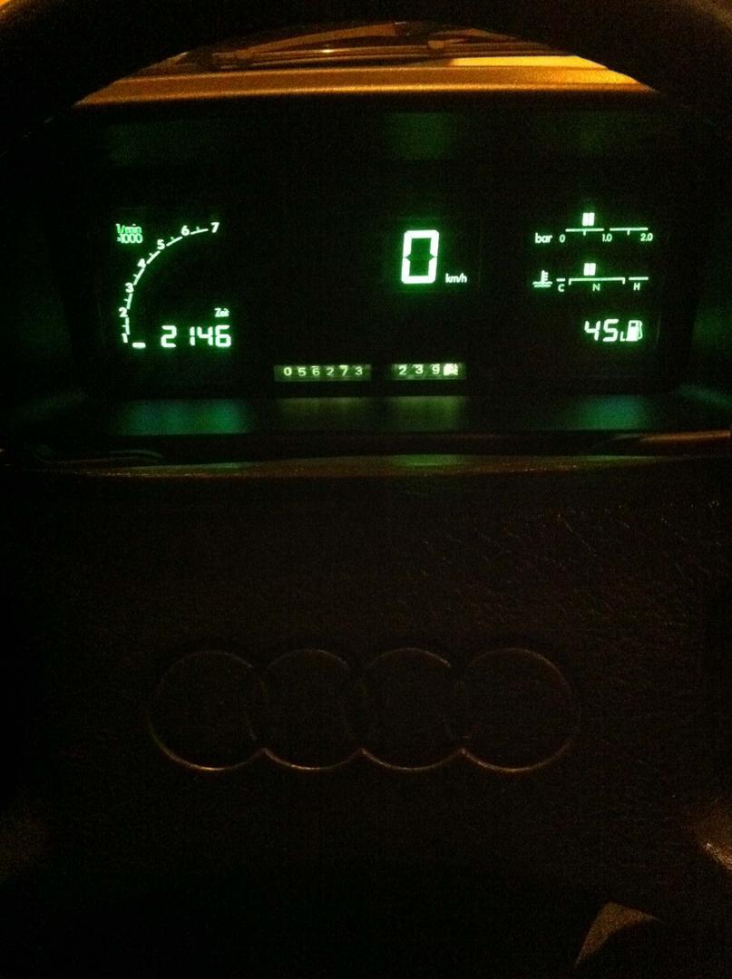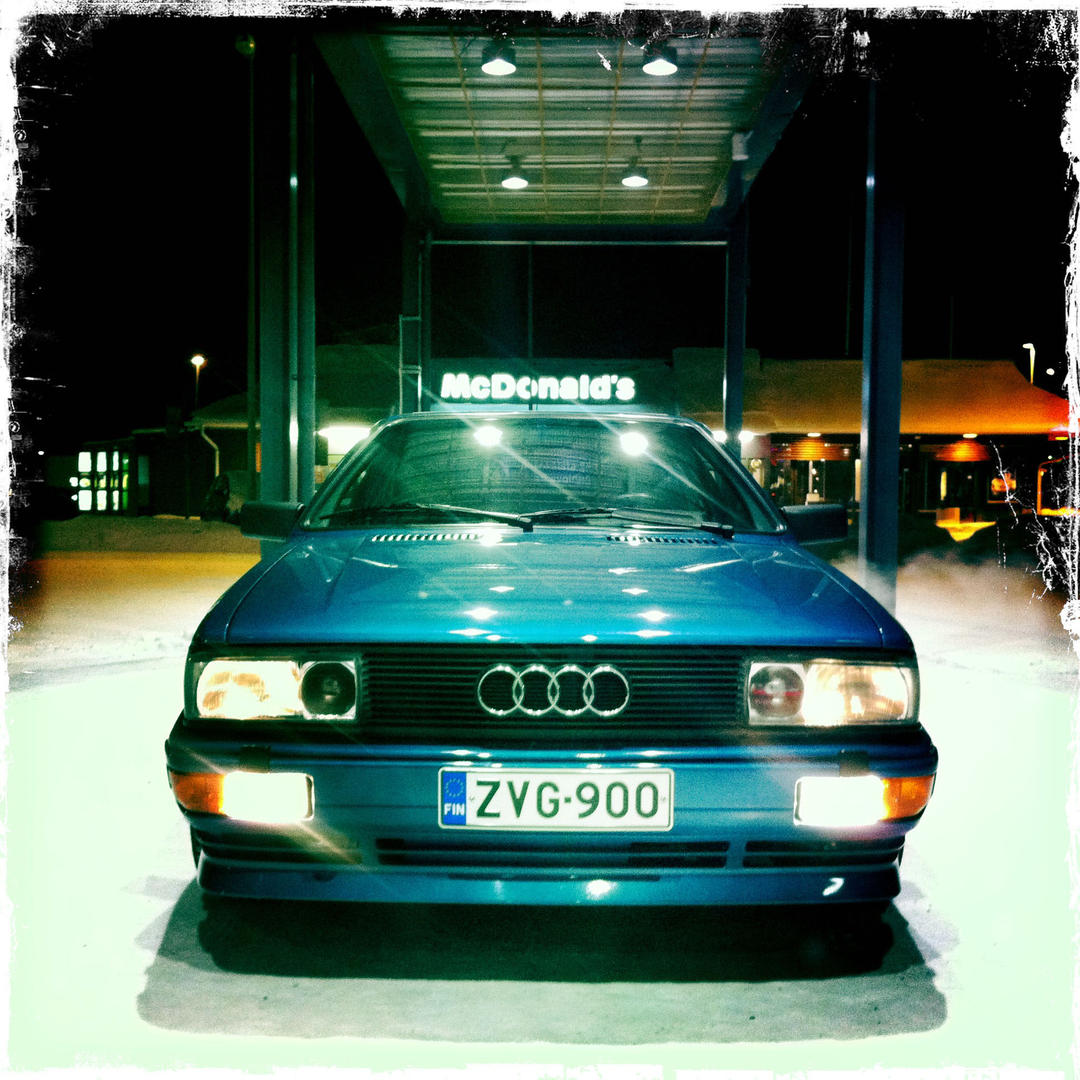 Kiertelimme autoa kaikessa rauhassa ympäri ja sitten koitti hetki, jolloin Quattro lyötiin tulille. Taisi siinä tulla housuun tippa jos toinenkin. Sitten autoa trailerille ja sitomaan. Tuolloin kello oli kutakuinkin 03:00. Tarkoituksenamme oli siirtyä toiselle hallille, jossa Quattron paperit ja mukana tulevat romppeet sijaitsivat. Olimme jo poistumassa pihasta, kun totesimme että eihän se etuvetoinen Pösön rottelo jaksa tuollaista massaa vetää liukasta mäkeä ylös. Kärry irti ja vetäjäksi vaihdettiin myyjän UrS4 Avant joka nelivetonsa turvin kiskaisi vaivattomasti trailerin mäen päälle ja kaikenvaralta ajoi sen vielä toiselle hallille perille asti. Hallilla teimme sitten tarvittavat paperityöt, löimme kättä päälle ja toivotimme hyvää matkaa toisillemme. Klo 04:00 me lähdimme ajamaan Kuopioon ja myyjä perheineen Jyväskylään.