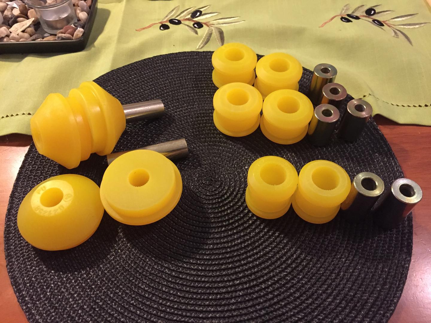 • Tilasin suoraan Strongflexiltä Puolasta etupään puslia 90Shr kovuudella. Ylätukivarsien puslat, etummaisen alatukivarren pusla iskarin kiinnitykseen ja taaempien alatukivarsien puslat. Etualavarressa onkin jo powerflexin tuote sisäpäässä. Koko läjä toimituskuluineen 135€, eli murto-osalla powerflexin hinnoista.