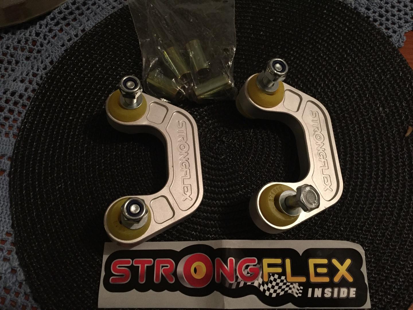 • Strongflexin puslat kyllä yllätti. Hinta-laatu suhde on kyllä kohdallaan. Tilasin lisää alustanosia ja oli sopivasti 50% alennuksessa Imprezan takavakaajantangot, jotka tiesin istuvan suoraan B5:n etuvakaajaan.