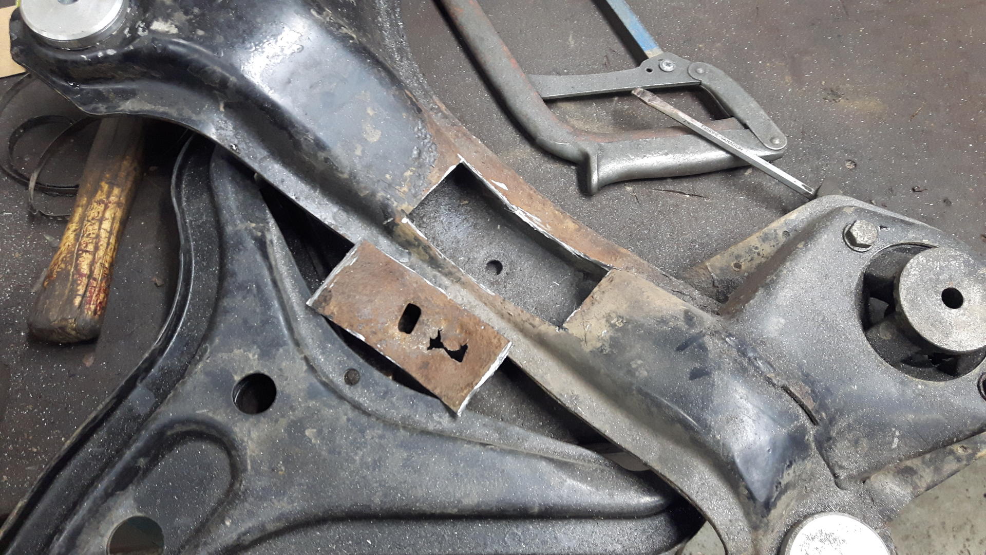 Samalla tuli tehtyä reikä apurunkoon kuskin puolelle vetoakselin alitukseen, eli sai alkaa hitsailemaan sitä vielä kaiken muun lisäksi. Vanha ruoteinen osa pois ja uusi tilalle 4mm levystä. Lopuksi vielä mustaa hammeriteä niskaan, ja saa kelvata.