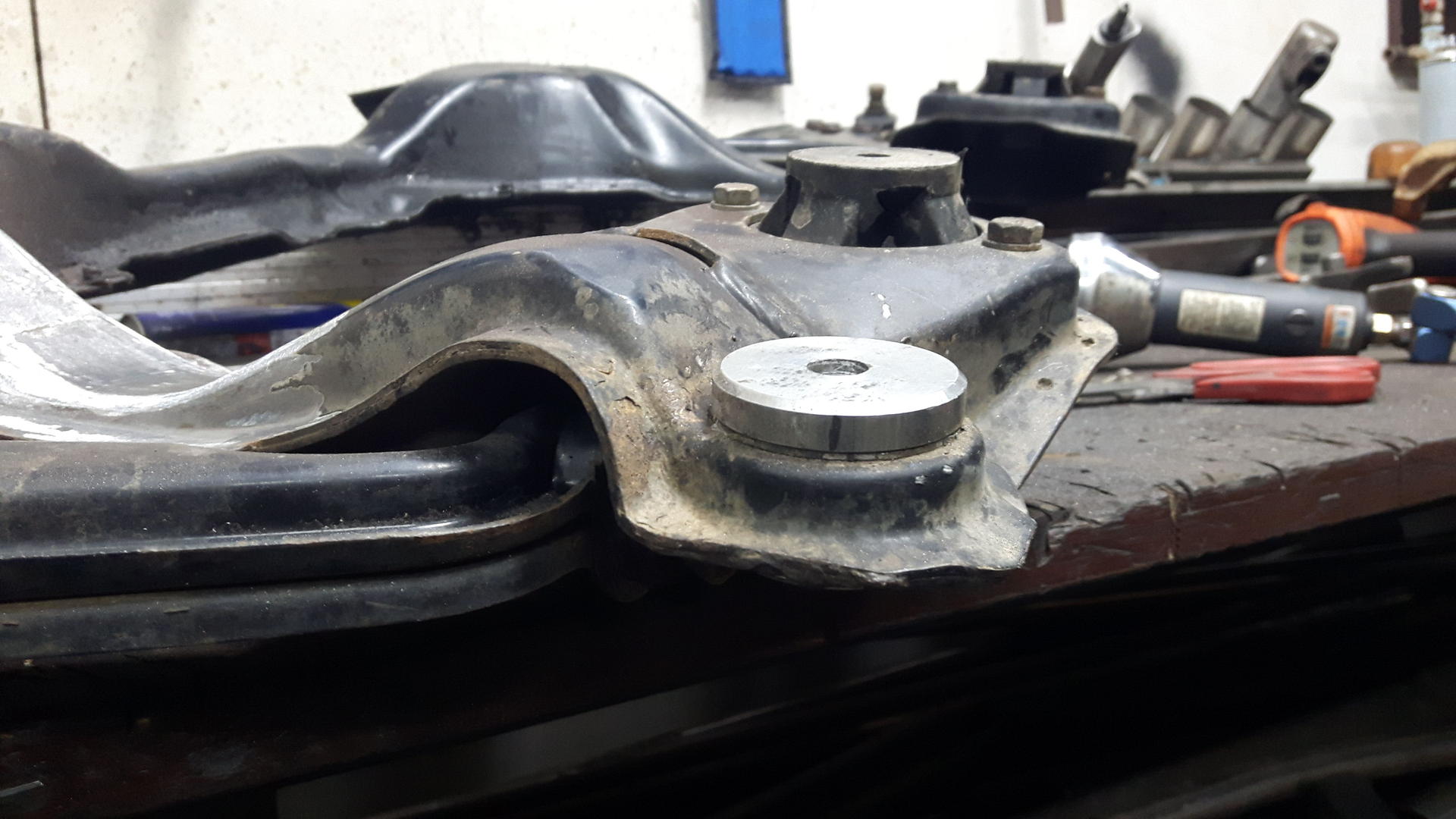 Apurungon puslien kanssa taas meinasi palaa järki. Paineilmataltalla ja kaikella muulla mahdollisella niitä sieltä melkein tunnin irroittelin. Prässiin en mitenkään järkevästi tuota saanut, kun ei ole oikea tasaisia pintoja mitä vasten laittaa erinäisiä holkkeja tms. Puslat kuitenkin loppuviimein sain vaihdettua, mitä nyt puslien reiät piti porata isommaksi 10mm -> 12mm, sillä puslat oli aikoinaan teetetty B3 koriin.