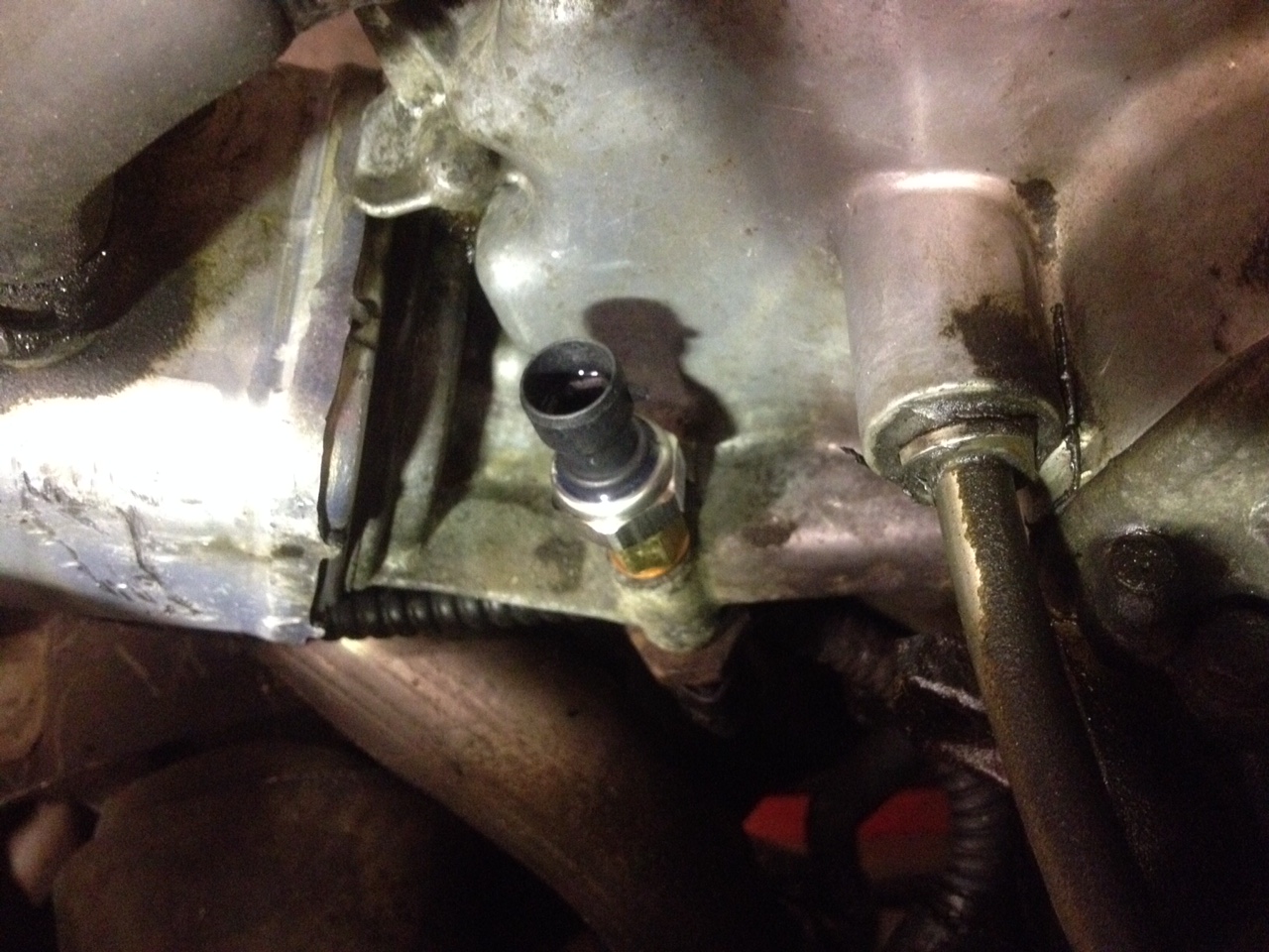Ilmanputsarillekkin saatiin viimein se lämpösuoja ja kun kone oli irti niin oli helppo myös asennella öljynpainemittari. Pienenä vinkkinä kaikille hommaa suunnitteleville voisi sanoa Prosport gaugesin mittareista löytyvän pientä paineanturia joka menee tuonne öljynsuodattimen luona olevaan nippaan pelkällä adabterilla. Yleisempi isompi paineanturi ei taida sinne koloseen mahtua ja vaatisi jonkinlaisen väliletkun.