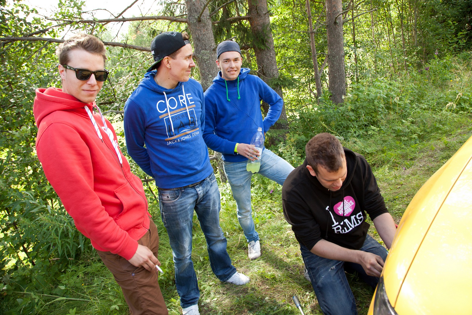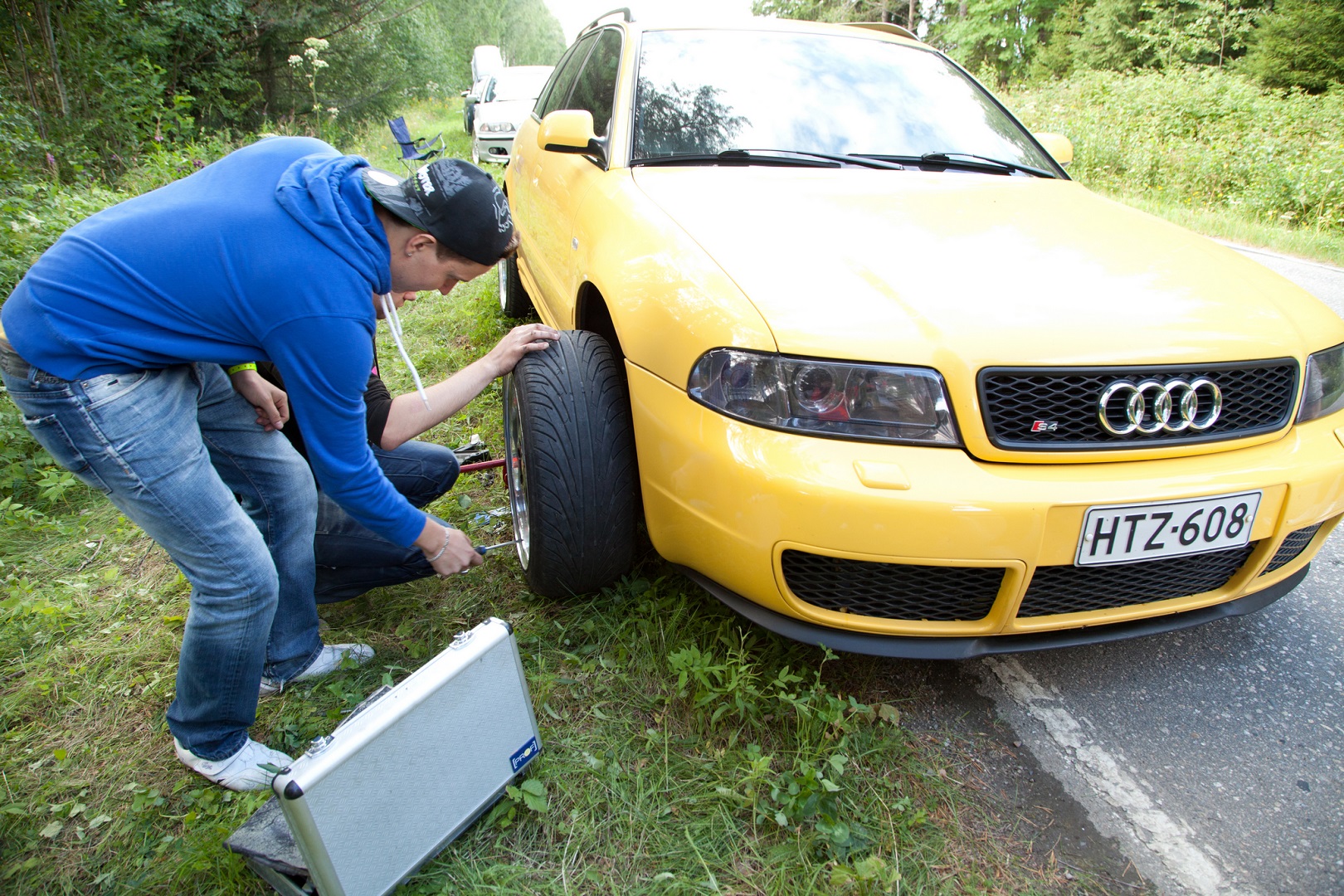 No motoparkista sitten lähdettiin iltapäivällä ajelemaan kotiin päin ja vähän ennen juvan abcia tapahtui seuraavaa; Oikea eturengas tyhjeni suoralla juuri ennen poliisien puhallusratsiaa. No pakkohan se oli tien viereen auto pysäyttää ja näin teki muutkin kaverit kun letkassa ajeltiin. Ei menny muuten kauaa että poliisit pyyhälti paikalle ja alkoivat kysellä että vaiheltiinkos sitä kuskia. Tajusivat sentään tilanteen vähän rengasta potkittuaan ja ottivat puhalluskokeen minulta siinä. Vikaa kun alettiin tutkimaan niin renkaassa ei ollut päällisinpuolin mitään vikaa, mutta vannetta tarkastellessa huomattiin että 8(!) kehäpulttia oli poikki ja ilmat tulevat ilmeisesti osien välistä karkuun. Onneksi olivat läpipultteja ja saatiin tehtyä toimiva ratkaisu M6 pulteista joilla ilmat pysyi sisällä ja sain auton takaisin karjalaan. Todennäköisesti noissa vanteissa on sattunut asennusvirhe, joko kiristetty reilusti liian tiukkaan tai jätetty sormitiukkuudelle... Muissa rilloissa ei ilmennyt onneksi mitään vikaa.