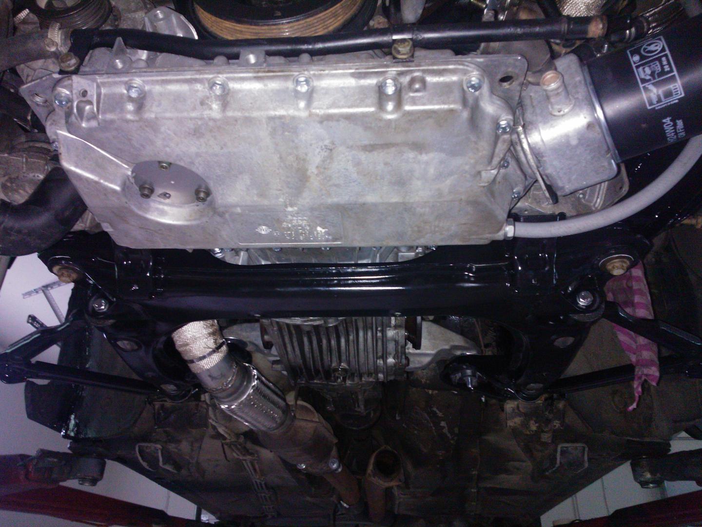 • Mulla on se vanha kumikiinnike, jota on hieman paranneltu sellaisella putkivirityksellä. Eli poikittaispalkkiin on hitsattu sopiva putki, johon kumikiinnike istuu tiiviisti. Muistaakseni viitosmoottorien nimeen vannovat harrastajat ovat käyttäneet vastaavaa keinoa moottorin keulimisen estämiseksi.