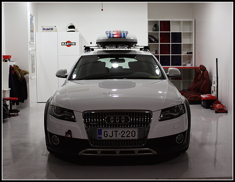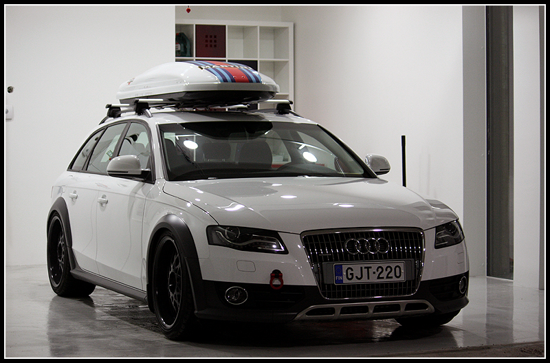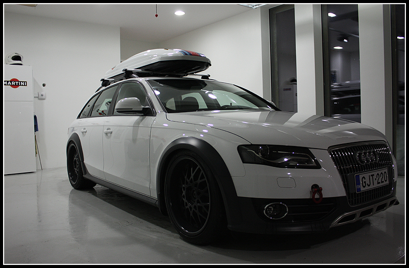 Hauskahan tästä "allroadista" tuli, tykkään. On tuossa monelle tavan Audimiehelle ihmettelemistä että miten niin allroad ja sitä mutinaa että onko tuossa mitään järkee :) Vanteita vaan ulospäin jos mahtuu tulemaan. Ootko miettynyt miltä näyttäisi jos puskurit ois kokonaan valkoset ja noi "alumiiniosat" puskureissa, maski ja kattokaiteissa mustia.