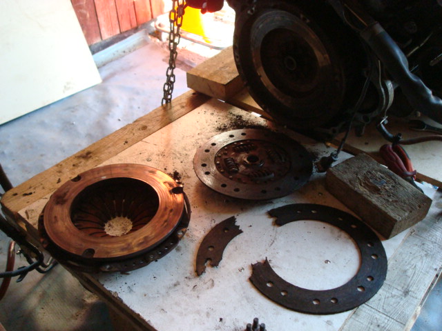 Kytkinlevy oli vähän häjymmässä kunnossa. Otettiin vaihdelaatikko pois ja tollainen sieltä paljastui sitten. Uusi lähti käyttöautolta heti tilaukseen 200,-. 26.08.2013 klo:19.11