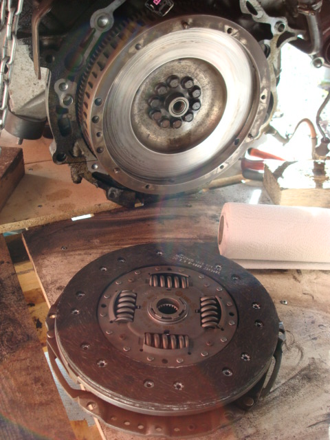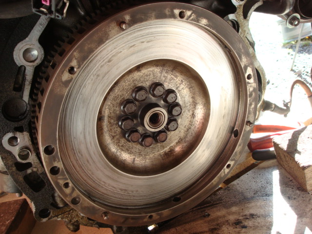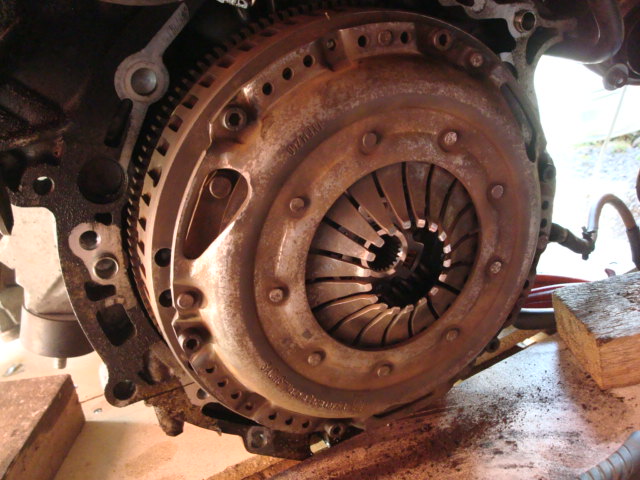 Ensin hion vauhtipyörän ja paineasetelman pinnan kevyesti 80p hiekkapaperilla. Niin vaan, että pinta menee karhean kiiltäväksi, ei siis hioda niin, että pinta alkaa kulumaan. Painelaakerin päähän vaseliinia ja sitten sovittamaan kytkintä asetelman kans kohdalleen. Tässä vaiheessa kun asetat asetelmaa niin ennenkuin kiristät asetelman pultteja kohdista silmämääräisesti tarkasti kytkinlevyn poorit ja painelaakerin reikä keskelle toisiansa, täten sinulla on mahdollisuus saada vaihdelaatikon akseli uppoamaan tarpeeksi syvälle vaihdelaatikkoa kiinnitäessä. Asetelman pultit 25Nm ristiin kiristettynä. Sitten vaihdelaatikko hollille ja tässä käytin emäntää apuna. Emäntä nytkytteli moottoria ja minä punnasin vaihdelaatikon paikoilleen. M12 pultit 65Nm ja M10 pultit 45Nm kireyteen ja homma hoidettu.