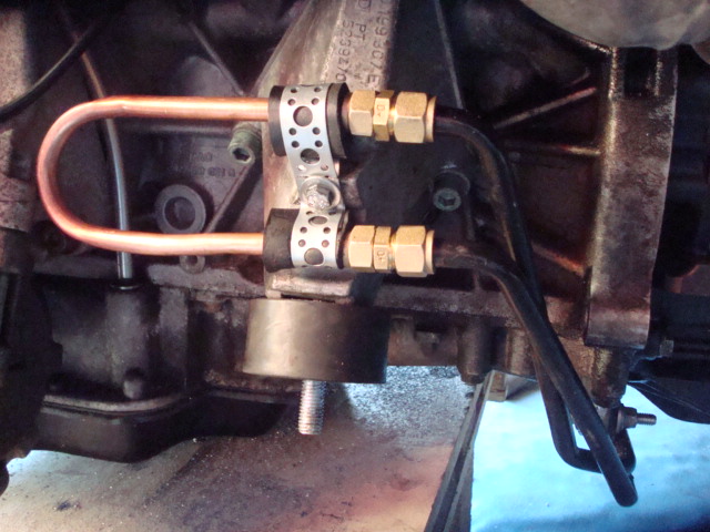 Sitten värkkäilin kupariputkesta U-mutkan vaihteiston öljynkierrolle. Katkasin vanhat putket sopivalta kohtaa ja ruuvasin kiinni helmiliitoksilla uudet.