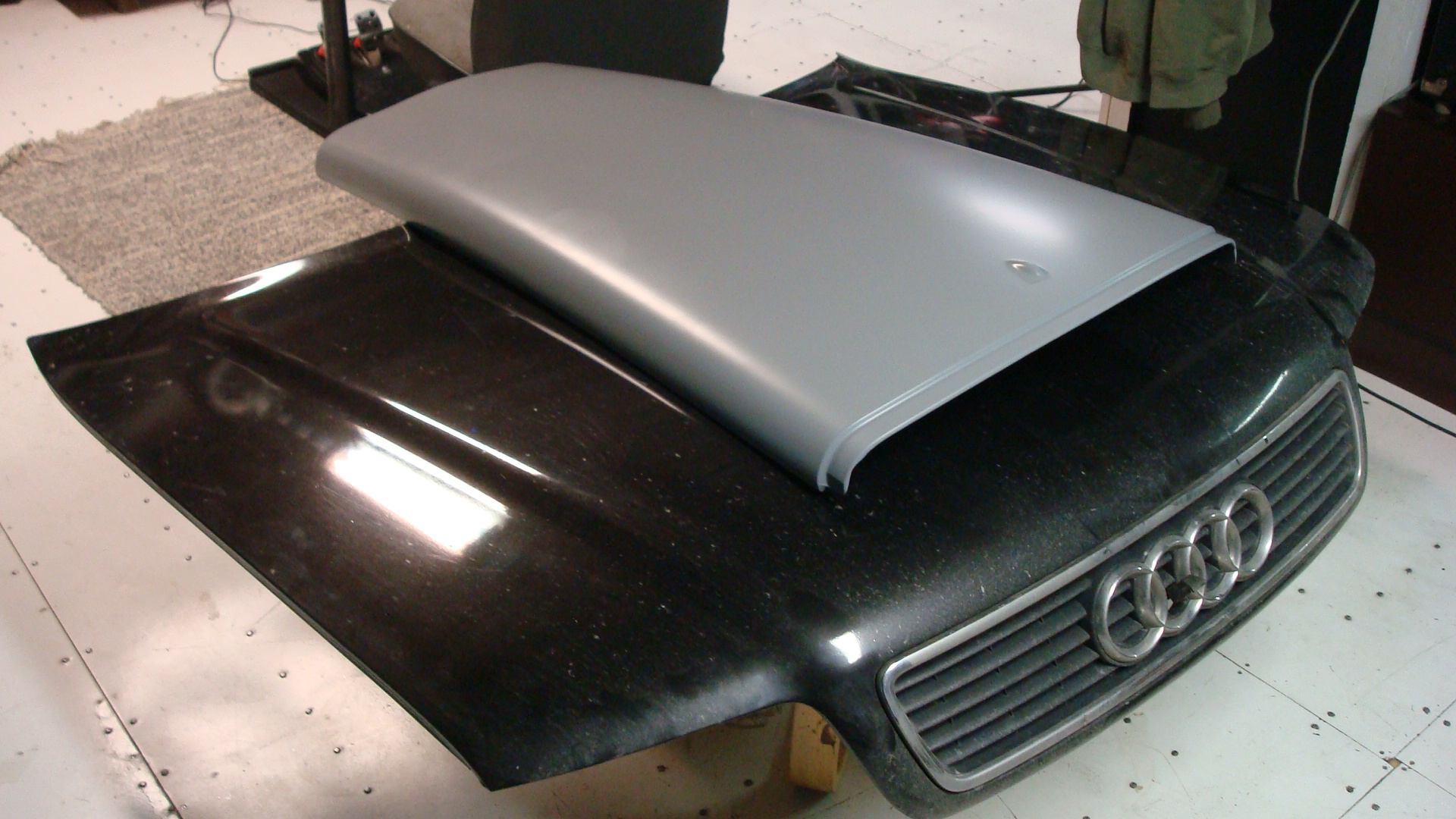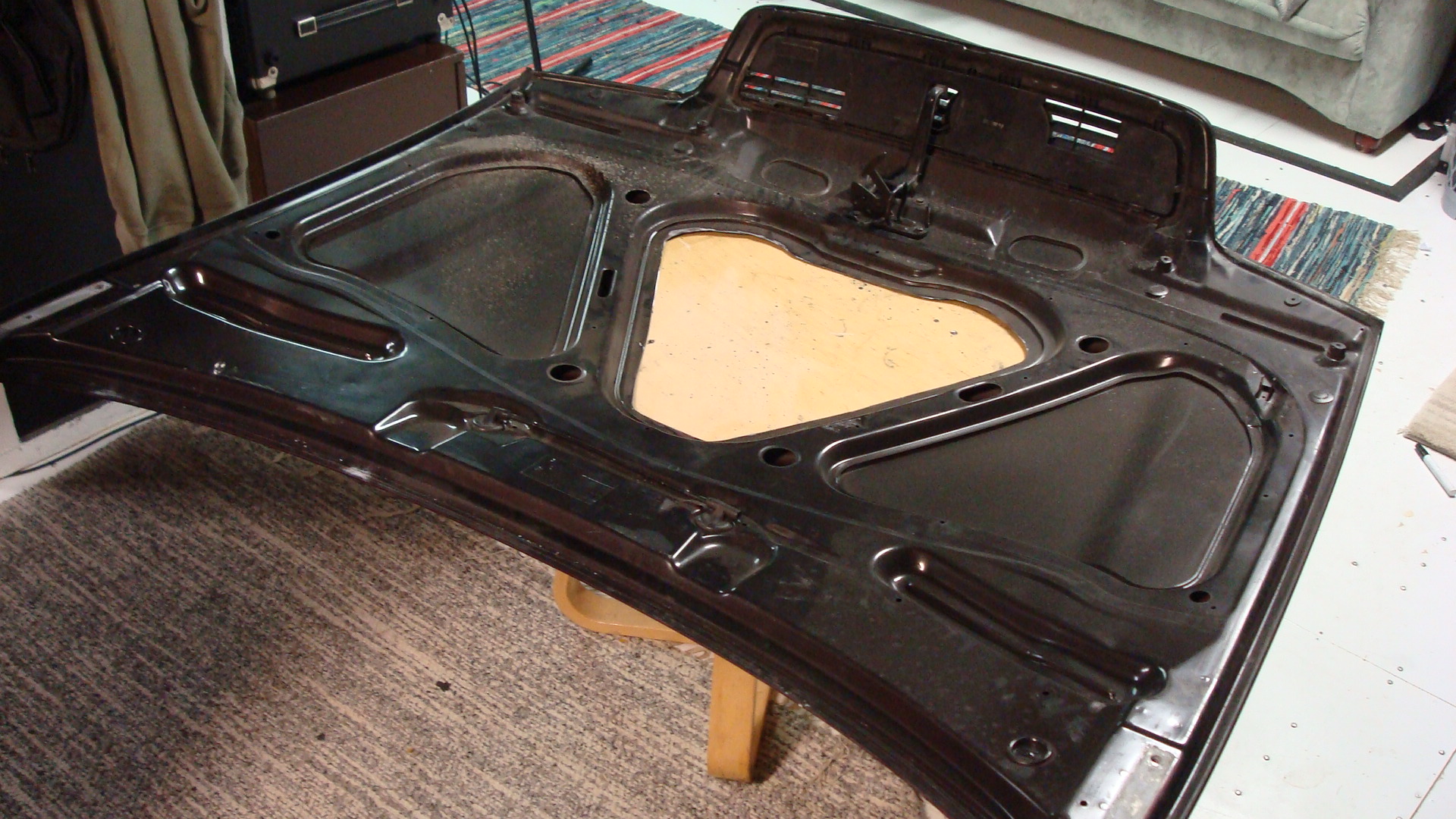 Pelituoli: Renault 5 kuljettajan penkki selkänoja säädöllä ja sille puusta nikkaroitu joustava kehikko :-P