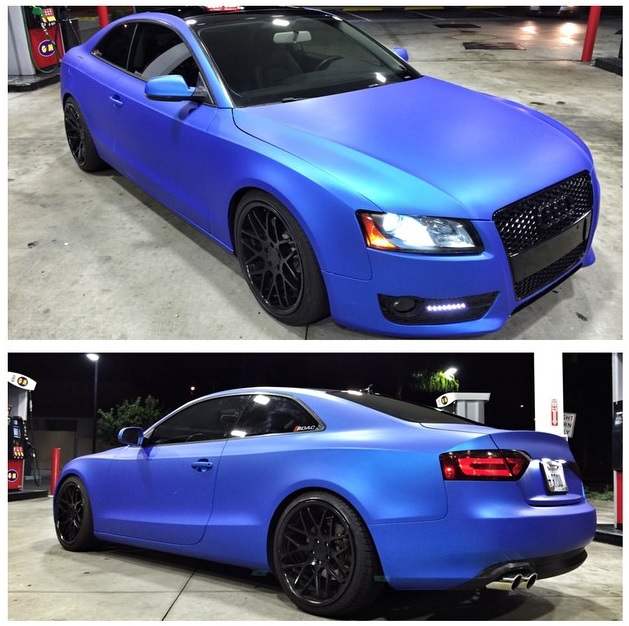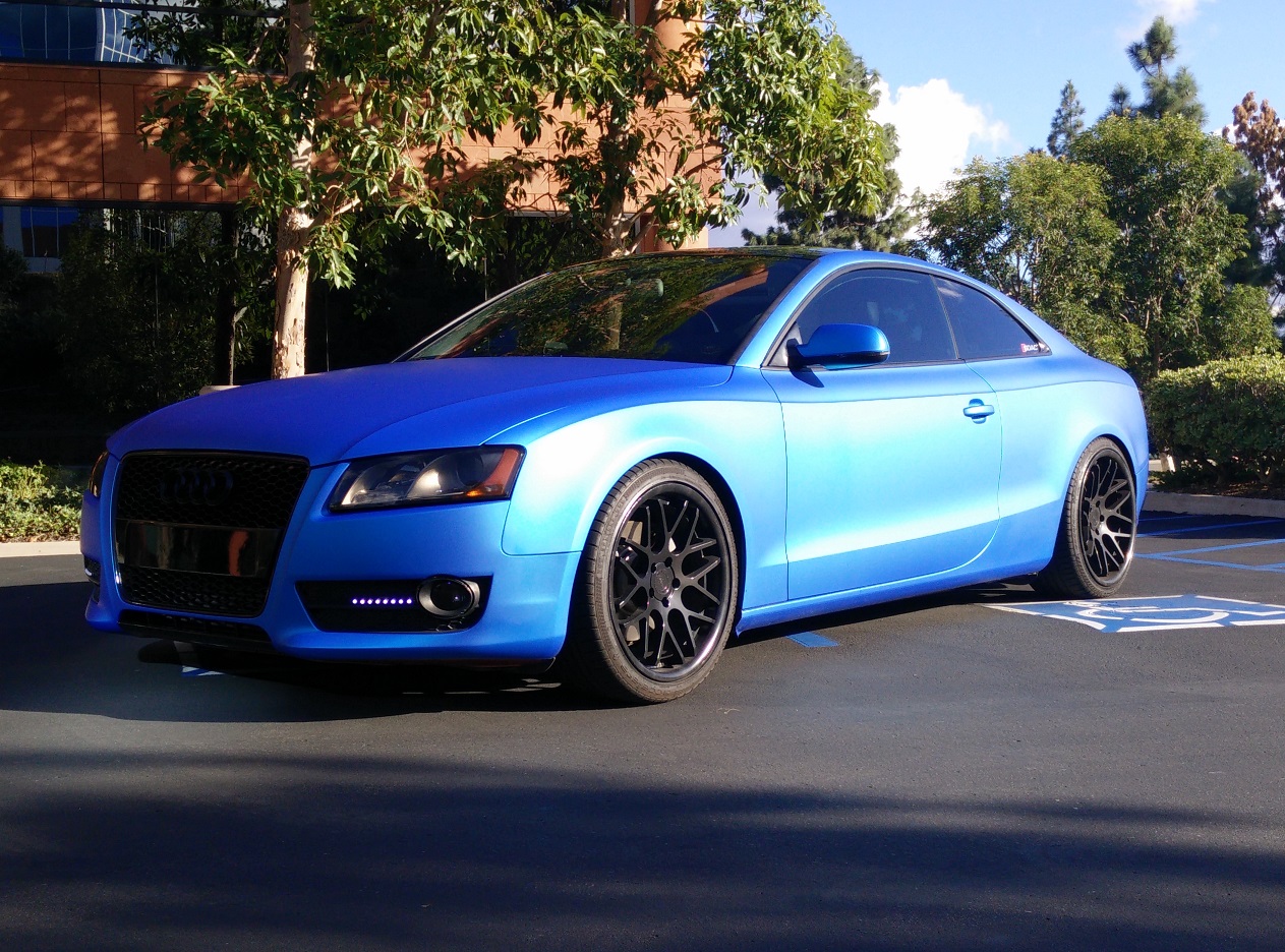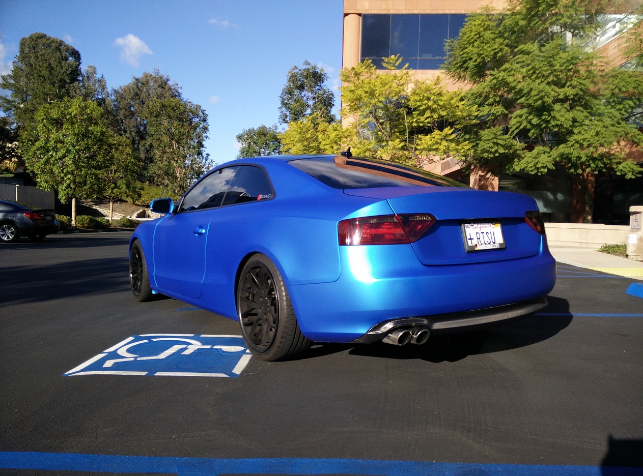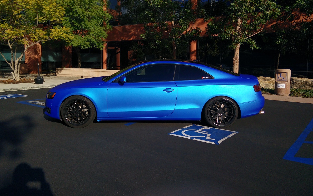 Teippauksen hoiti SDWrap Teippi on Arlon Matte Blue Aluminum. Pojilla on niin kova kiire, että sisustan osien teippaus tehdään kunhan ehtivät. Samoin ulkopuolella peilien alaosat ja katto teipataan, ynnä muita pikku pisteosia. Teippauksen hinta on noin kolmesta tuhannesta dollarista ylöspäin, minun on kaverihinta. Hintaa pudottaisi myös halvempi vinyyli, tuo alumiinisävy on kalleinta. Ensi kesälle ehkä tulossa uutta vannetta, viidellä puolalla. Katsotaan mitä säästöpossu silloin sanoo.