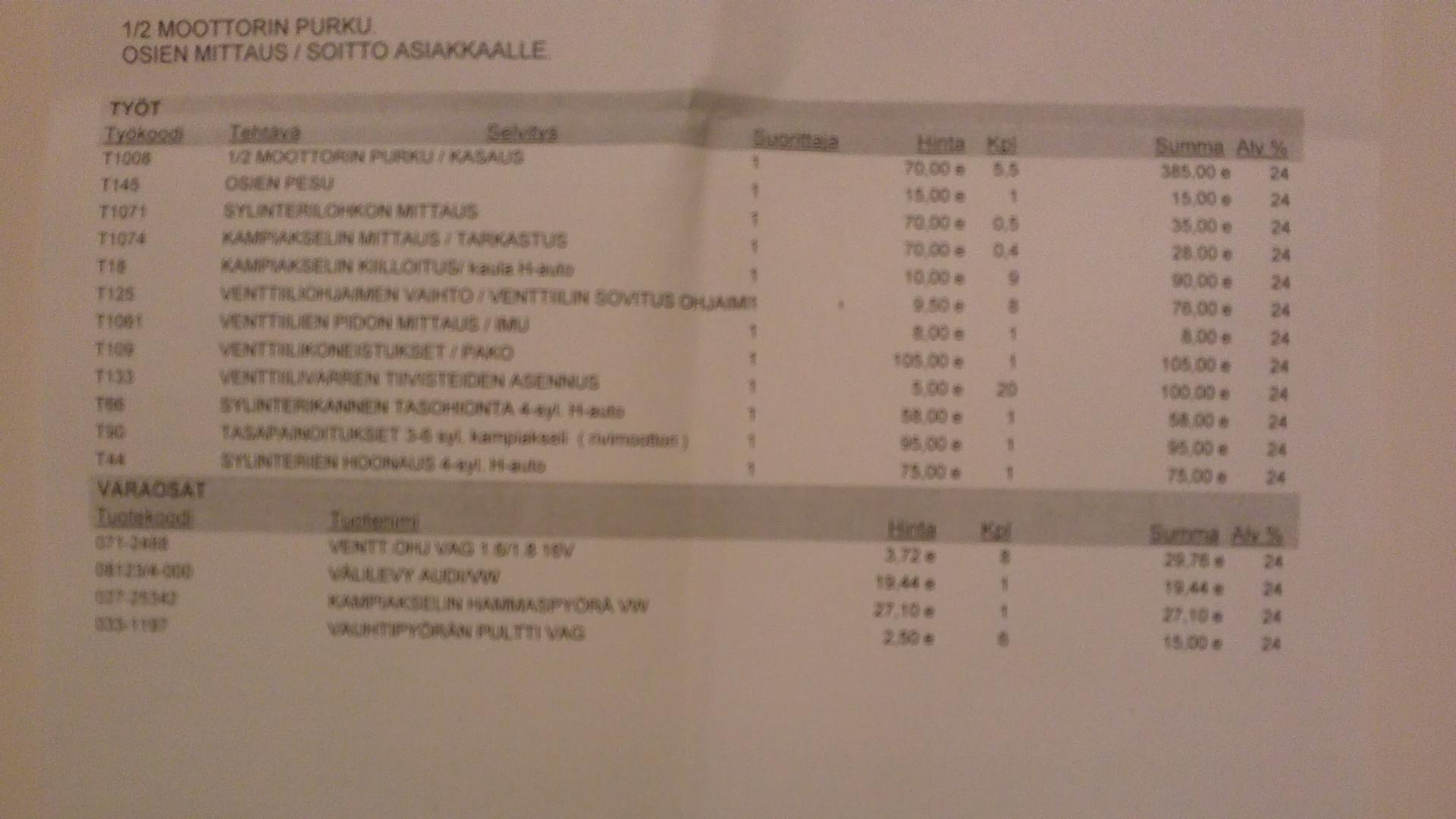 • Tänään hain alakerran koneistamolta ja voin kertoa, että tuli soitettua ihan muutama puhelu noista hinnoista tai pikemminkin työajasta mikä siihen käytetään. Audin omaan merkkihuoltoonkin tuli soitettua ja kysyttyä kauanko heidän työaika on moottoria kasattaessa, heillä aika oli 6,8 tuntia. Lohkon vein koneistamolle aika raakileena. Kampiakselin pultti kuului heidän töihin ja kasauksessa männät, veivit, kampiakseli, öljypumppu ja öljypohja paikoilleen sekä vauhtis. Työaikaa kasaukseen kului viisi tuntia. Toisella koneistamolla oli kasausaika 3 tuntia, kun kysäisin. Toivon mukaan on kunnolla mitattu ja hartaudella kasattu, että kestää. Kehui, että kasaukseen käytettiin todellisuudessa 10 tuntia, että vain puolet on laskulla.