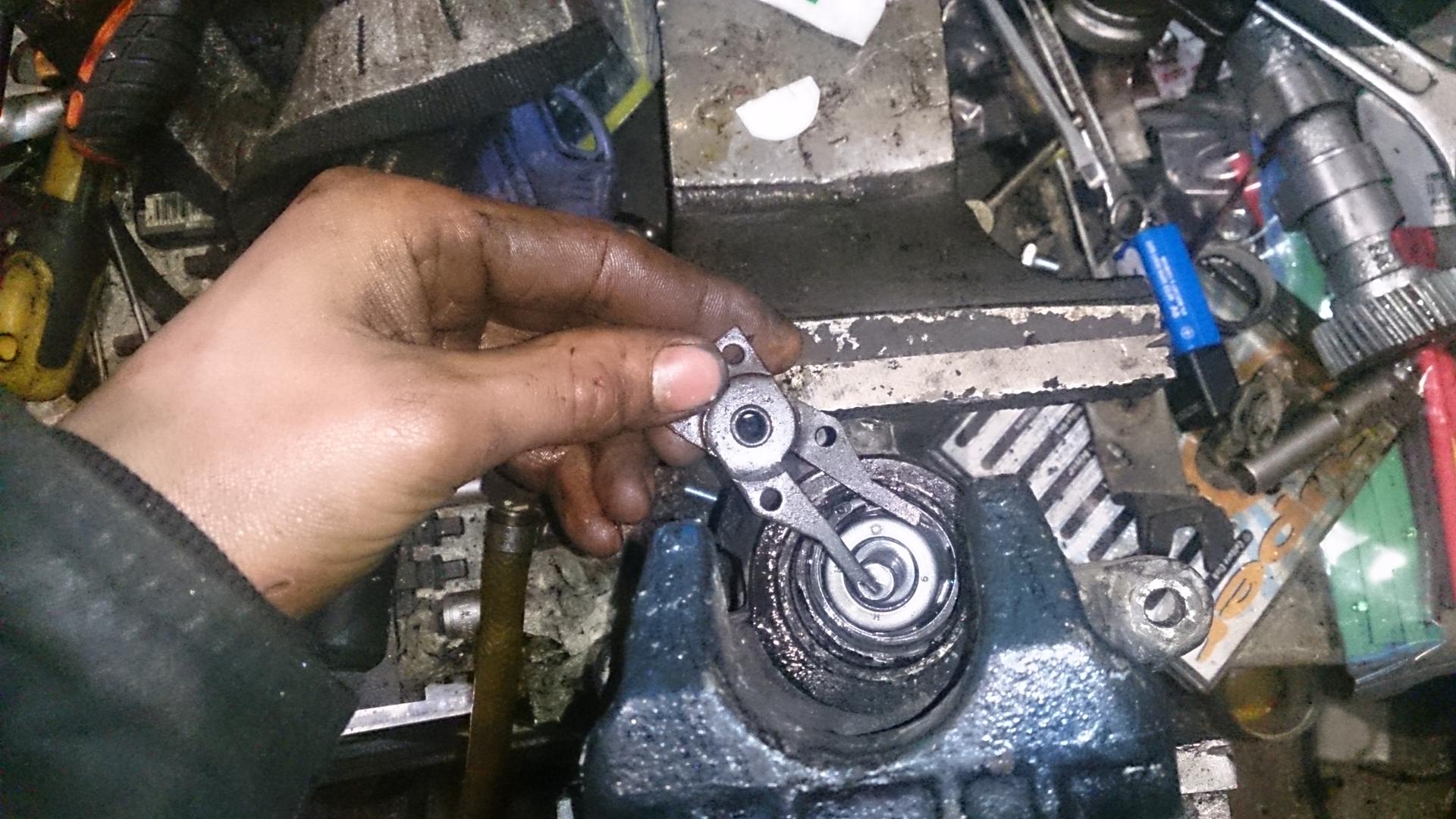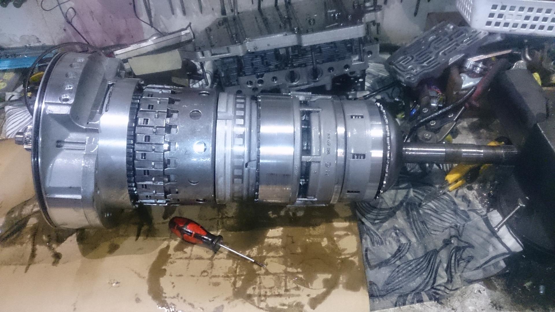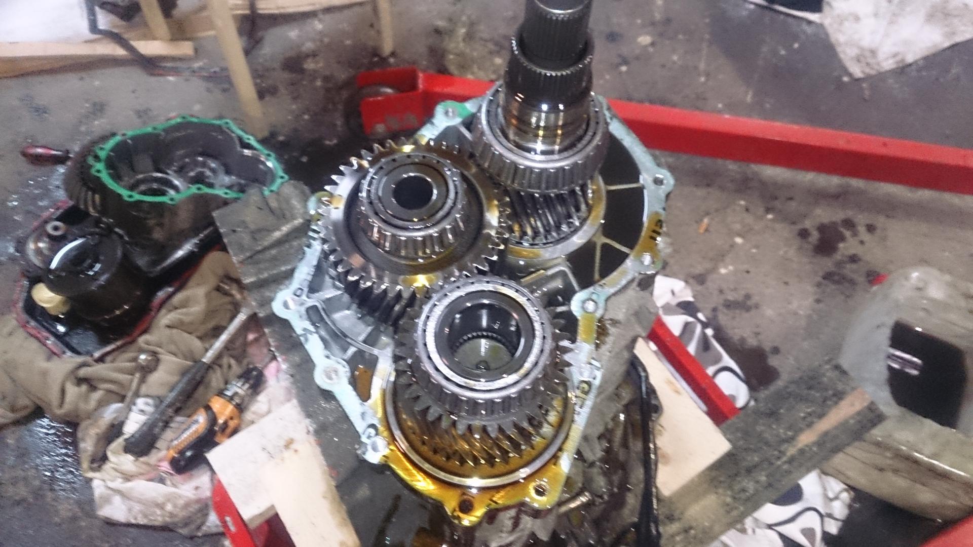 Laatikko purkaantuu kytkinkoteloon päin, pultit sieltä auki ja saattaa kaivata pikku napsun että irtoaa, sen jälkeen ei ole kuin nostella pakkoja ja kruunuja pois, välissä on laakereita ja shimmejä joten ole tarkkana kun otat pakkoja pois.