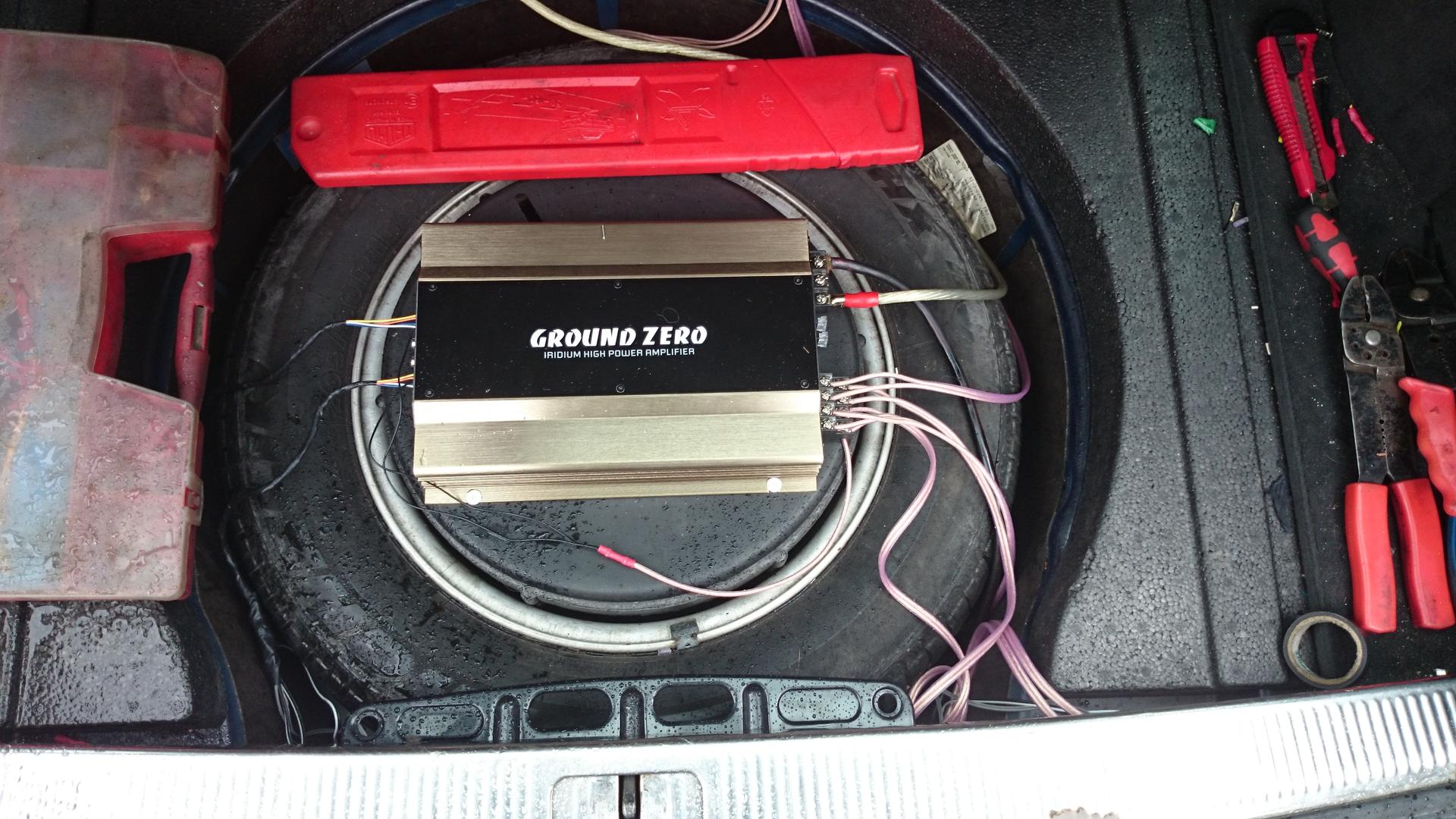 Omat kauittimet ei oikein soineet niinkuin oisin halunnu niin vaihoin kauittimet eteen ja taakse. Takana jyskää nyt 6.5" Jbl:llät, edessä 6.5" ground zerot ja näitä kaikki soittelee ground zeron vahvistin. Vahvistimen kytkentä sinne ei nyt sinällään hankalaa ollut mutta vaivallollista, kun joutuu vetämään piuhat soittimelta konttiin.