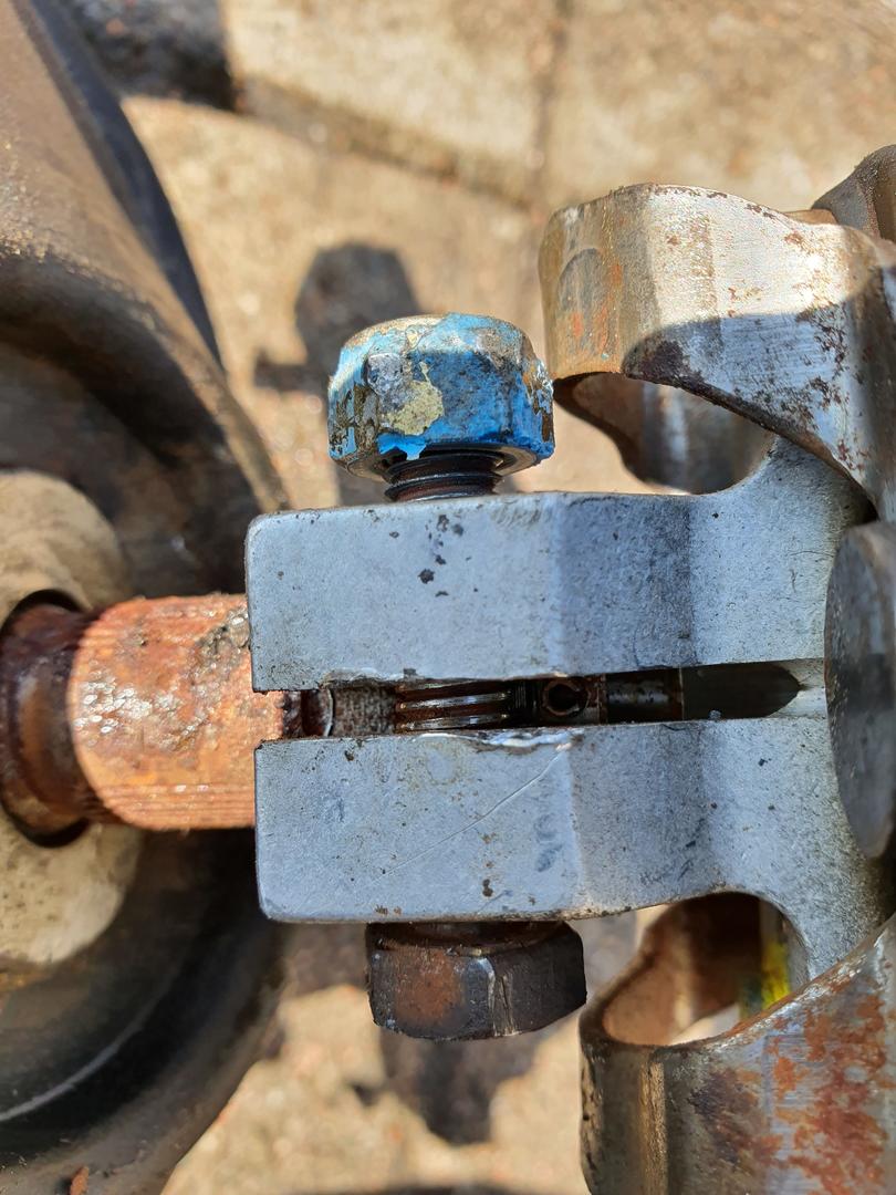 Vaihteensiirtäjän alapään pultista kannat pyörähtivät tietenkin pyöreiksi. Meni hetki miettiessä, miten hitossa tuo tulee pois, kun ei se laatinkonkaan päästä irronnut, eikä tilaa ollut lyödäkään. Viimein kepin juuresta, suojakumin alta löytyi haarukkaa paikallaan pitävä ruuvi, jokna irrotuksella koko keksintö tuli autosta pois. Edellisella remontoijalla ei ole ollut kärsivällisyyttä etsiä, mutta hitsivehkeet hänellä on olleet. Siirtäjätanko oli vedetty kahdesta kohtaa poikki ja räitty hitsaten takaisin kasaan. Siistitään tuokin nyt, kun irti on. Lootan päästä kiinnitys oli krymppääntynyt aika tukevasti. Lyömisellä ei ollut mitään tekoa. Lämmityksen jälkeen alumiininen kiinnike irtosi melkein pyytämällä.