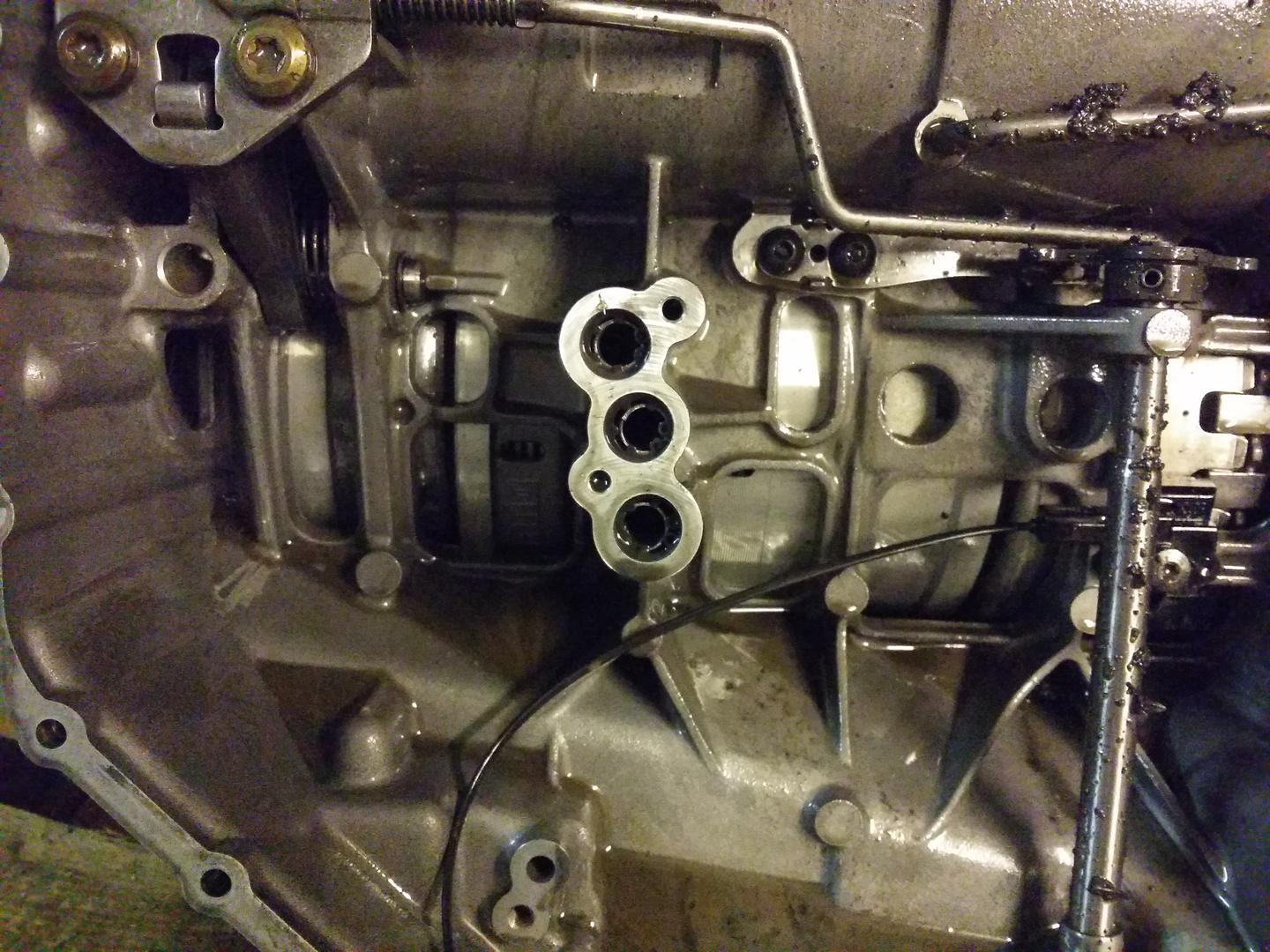 Venttiilipöydän irrottaminen laatikosta vaatii usean pultin irrottamisen. Pultteja on kolmea eri kokoa. Isompia T40 kokoisia jotka pitää irrottaa kaikki ensimmäisen kuvan mukaisesti + yksi alhaalla oikealla oleva joka unohtui ruuvata pois ennen kuvan ottoa. Kuvassa 2. näkyy lisää reikiä, nämä T27 kantaiset pultit pitää myös irrottaa. Kaikki muut jäävät, niillä pidetään venttiilipöytä kasassa eikä niitä ole syytä irrottaa tässä vaiheessa.