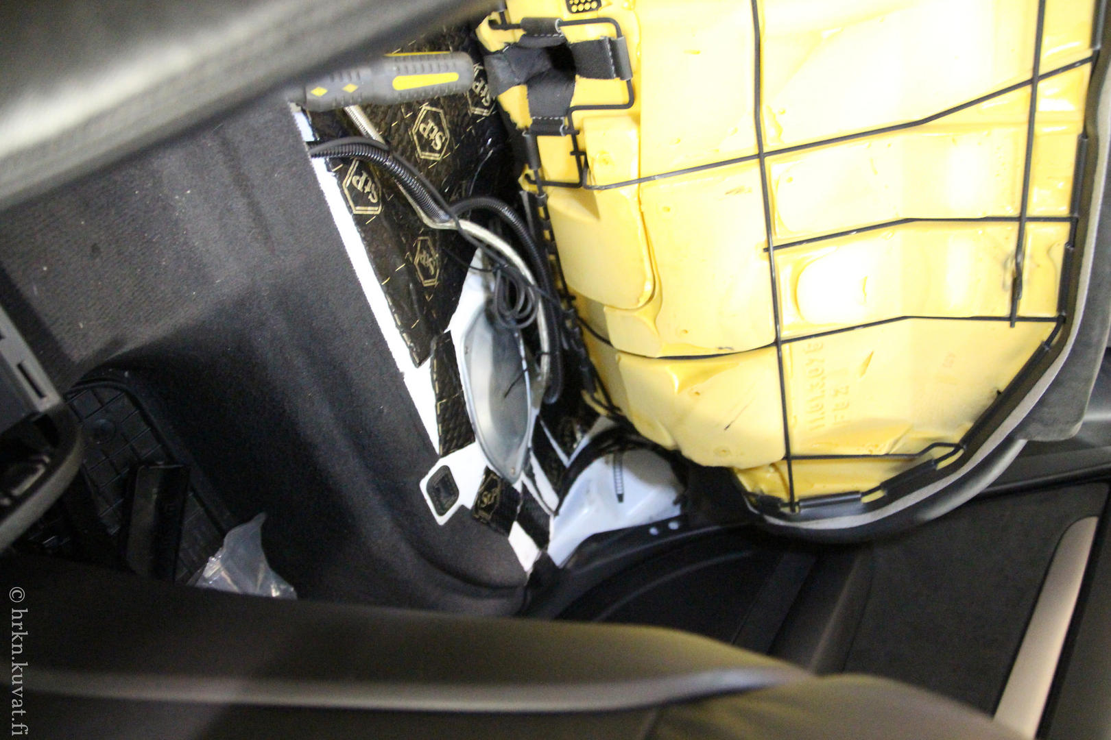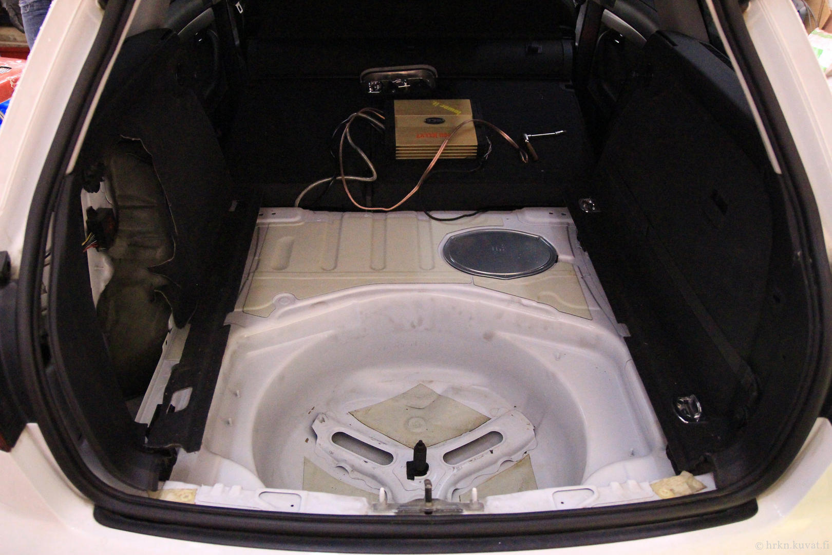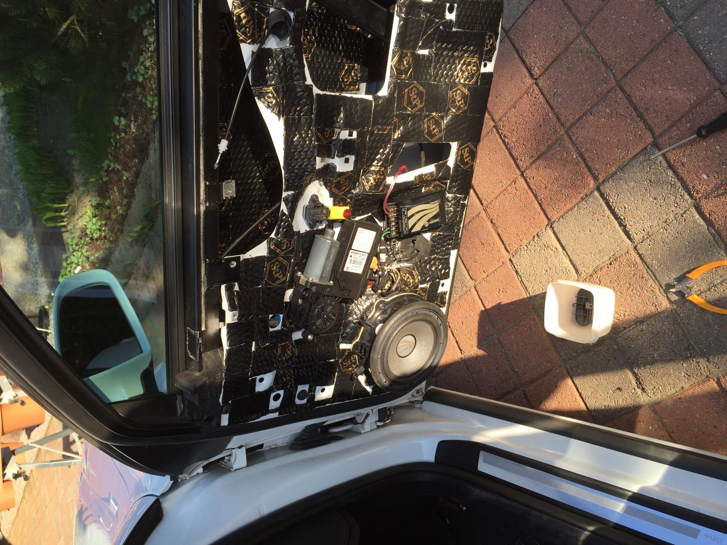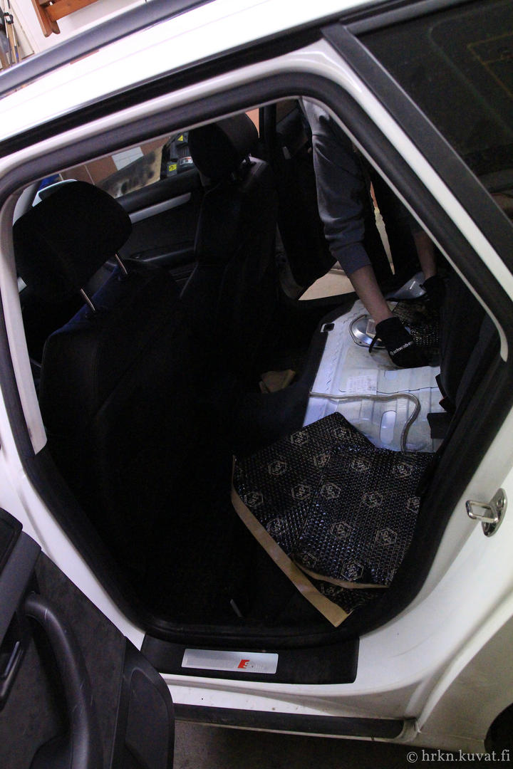 Iski myös motivaatio ja purettiin ovet. Black Goldia pelteihin ja erkkasarjan vaihto. Vanhoista kajareista askartelin adapterit uusille ja diskantit meni vakiopaikoille pienellä puukottamisella. Jakosuotimenkin sai ovipahvin alle jemmaan. Täytyy vielä tutkia, kun nyt ei pelaa ovien nappulat ollenkaan... :D Toivottavasti vaan liitin jäänyt irti... Takaovien ja takaluukun kannen vaimennus olis vielä joku kaunis päivä tehtävä.
