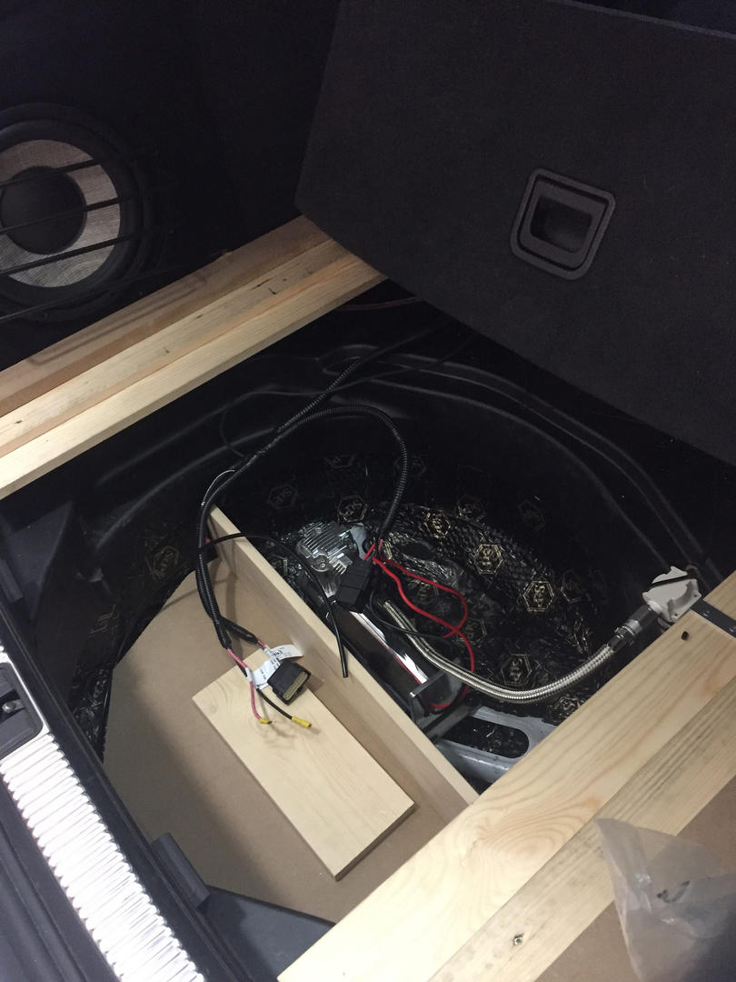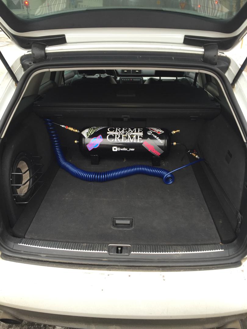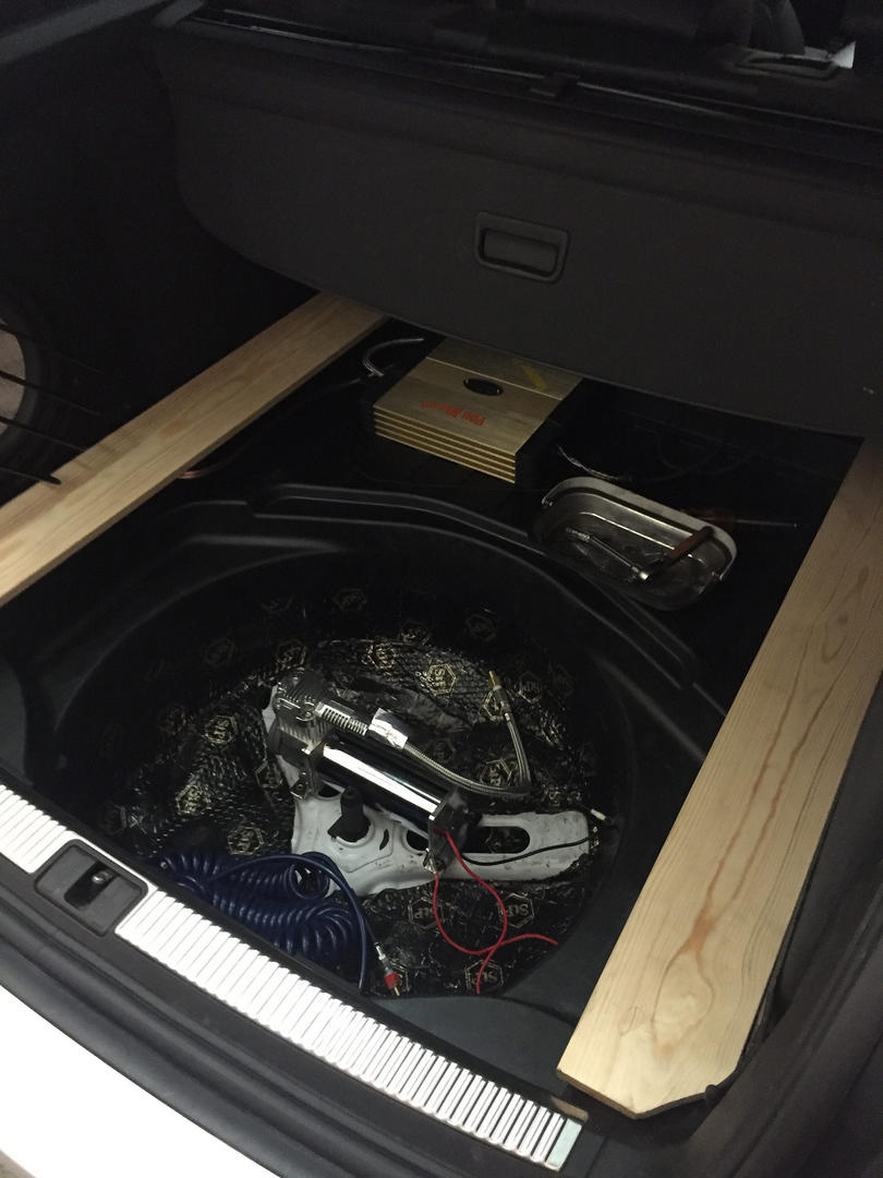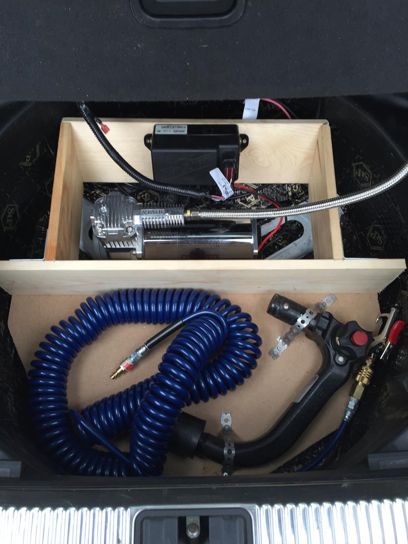Lisätään tähän samaan vähän asennuksista: Kompura tuli vararengaskoteloon kiinni. Sieltä löytyi lattiasta sopivat metalliset "kohokkeet", joihin sen sai niittimuttereilla kiinni. Pyöräkotelo ja kontin lattia tuli vaimennettua samaan syssyyn. MDF-levystä ja laudasta leikeltiin vakiolattialle vähän nostoa ja pyöräkoteloon kiinnikkeet myös venttiiliblokille. Pyöräkoteloon tulee vielä verhoilut ja pieni säilytyslaatikko. Sähköt vedettiin keskikonsolin sisässä ja ilmalinjat apukuskin puolelta verhoilujen alta hanskalokeron takaa konetilaan, josta linjat pyöräkoteloihin. Takalinjat kontin pohjasta läpiviennistä läpi ja takapusseilla muutaman kiinnikkeen kautta. Kaikki tosiaan rokkaa nyt, paitsi oikea etunurkka pääsee jostain vuotamaan. Laittelen asennuksista kuvia tosiaan myöhemmin.
