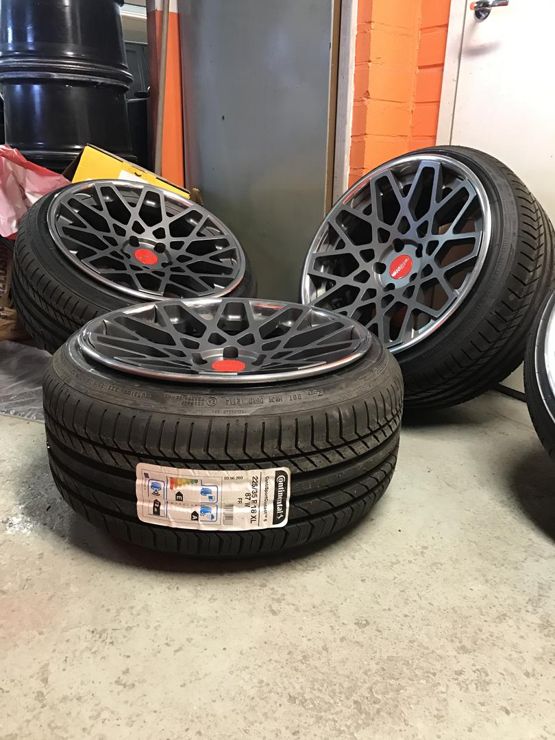 Renkaat saatu vihdoin vanteille. 225/35 Continentalit ja vanteethan siis 10,5 leveät. Maukkaat venyt tuli ja tykkään isosti. Myös maalaushommat valmistui, keula uusiksi ja takakaarista taisteluarvet pois. Tällä hetkellä kasaaminen vielä kesken. Lokarit on paikoillaan, mutta vielä täytyy puskuri laittaa kiinni ja sisälokarit paikalleen. Sitten taidankin ajella leimalle. Tuulilasi pitäisi kans vaihtaa, on taas halki paristakin kohtaa.