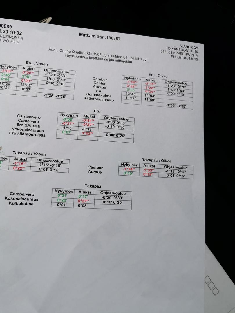 Auto kävi kulmien säädössä asentaja valitteli että raidetangot on liian pitkät ja nyt ratti jäi vähän vinoon.
