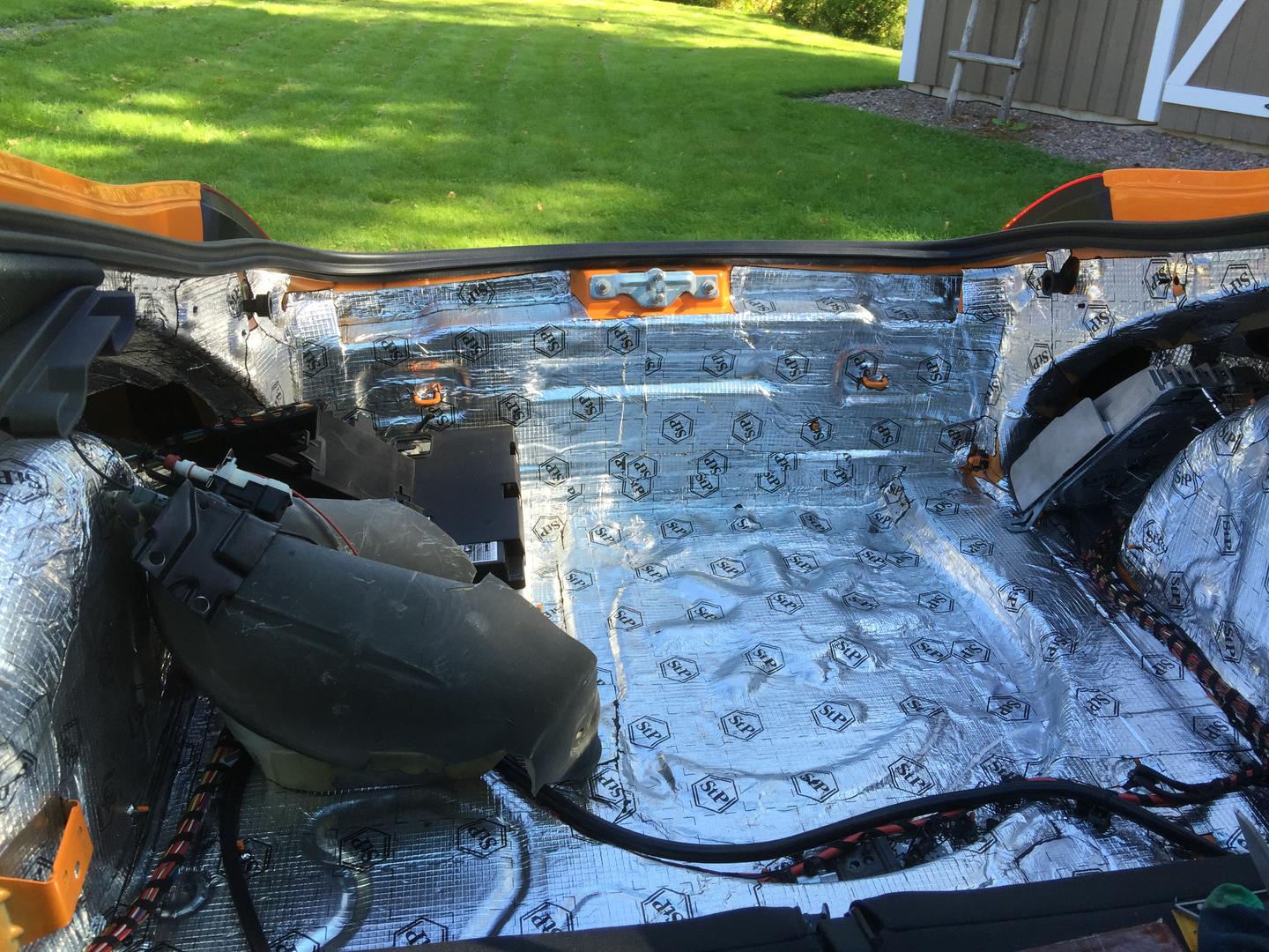 Eli ei muuta kuin peräpään verhoilut pois, vaimennusmattoa alle ja rouhepuristeista vaahtomuovimattoa päälle. Kyseinen käsittely tuli sekä takakontin että takapenkin pohjalle ja sivuille.