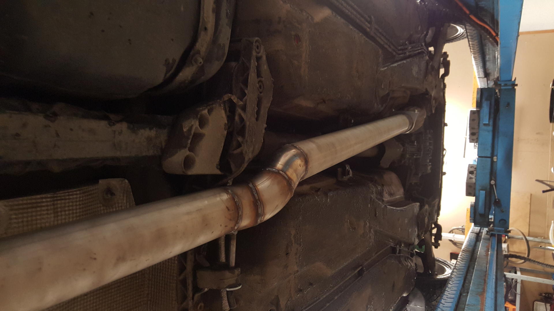 Tänään värkättiin 3" rosteriputki kun sattui olemaan hyllyssä vajaa kanki suoraa putkea ja pussillinen 45 asteen mutkia. Vähän äänekäshän se vielä on, kun ei ole kuin yksi vaimentaja mutta lisää sitten toisen vaimentajan jouston luokse jos ne alkaa häiritsemään. Ja joo, ne saumat olisi pitänyt tigillä tehdä mutta kaasu oli loppu ja ei maltettu käydä vaihtamassa pulloa... Kai se kestää ihan mikkiliimallakin.