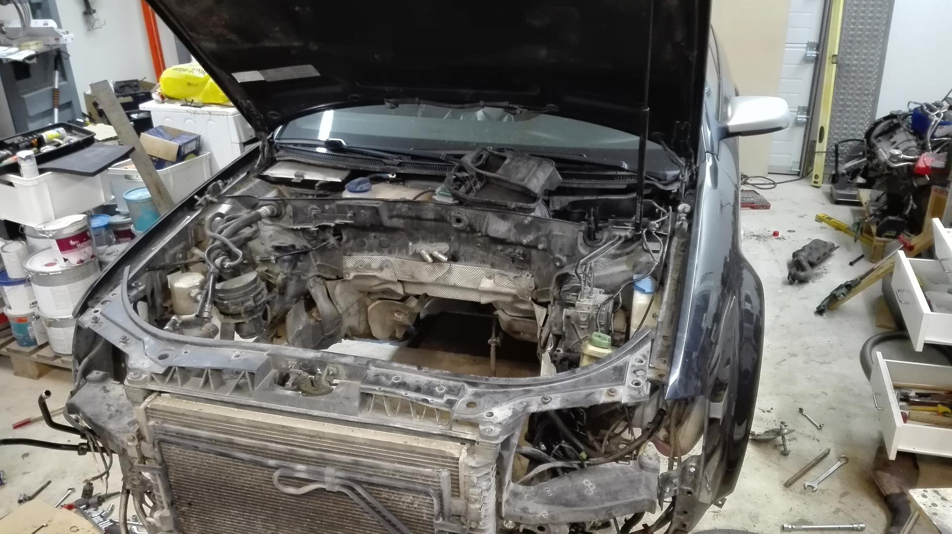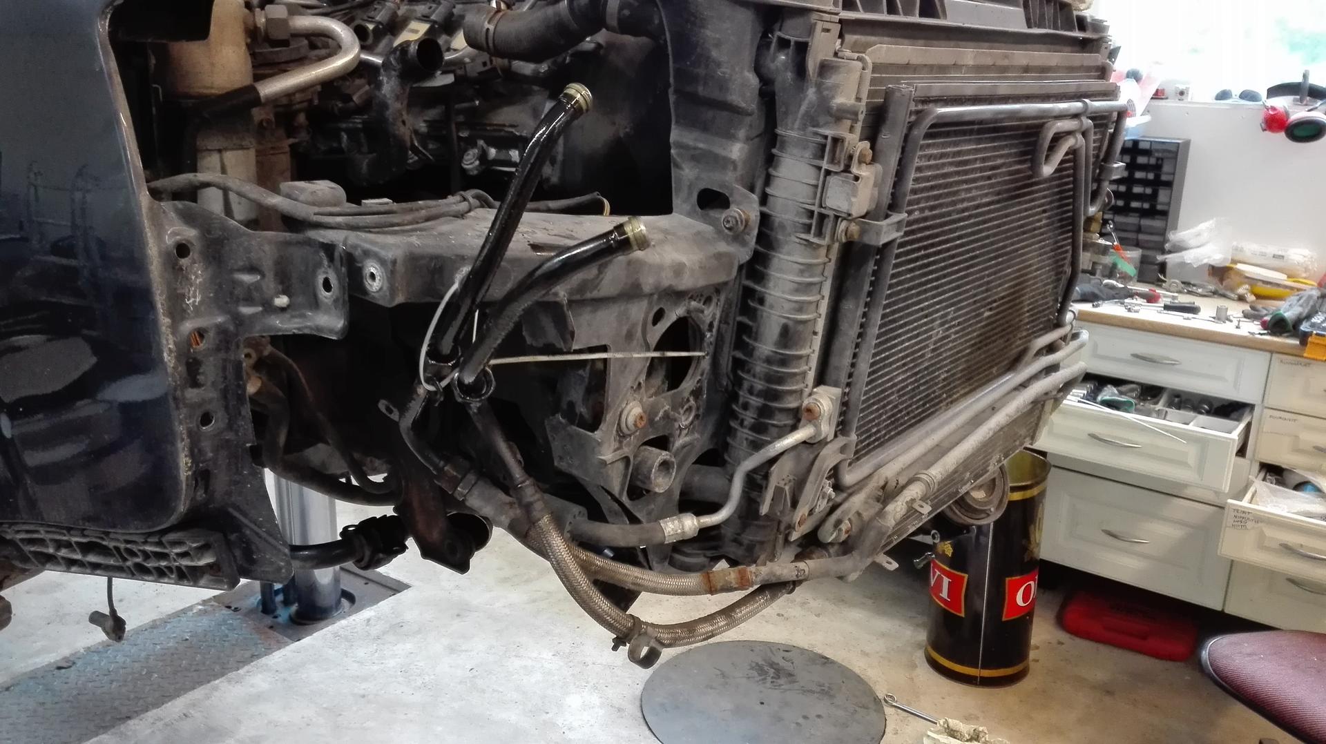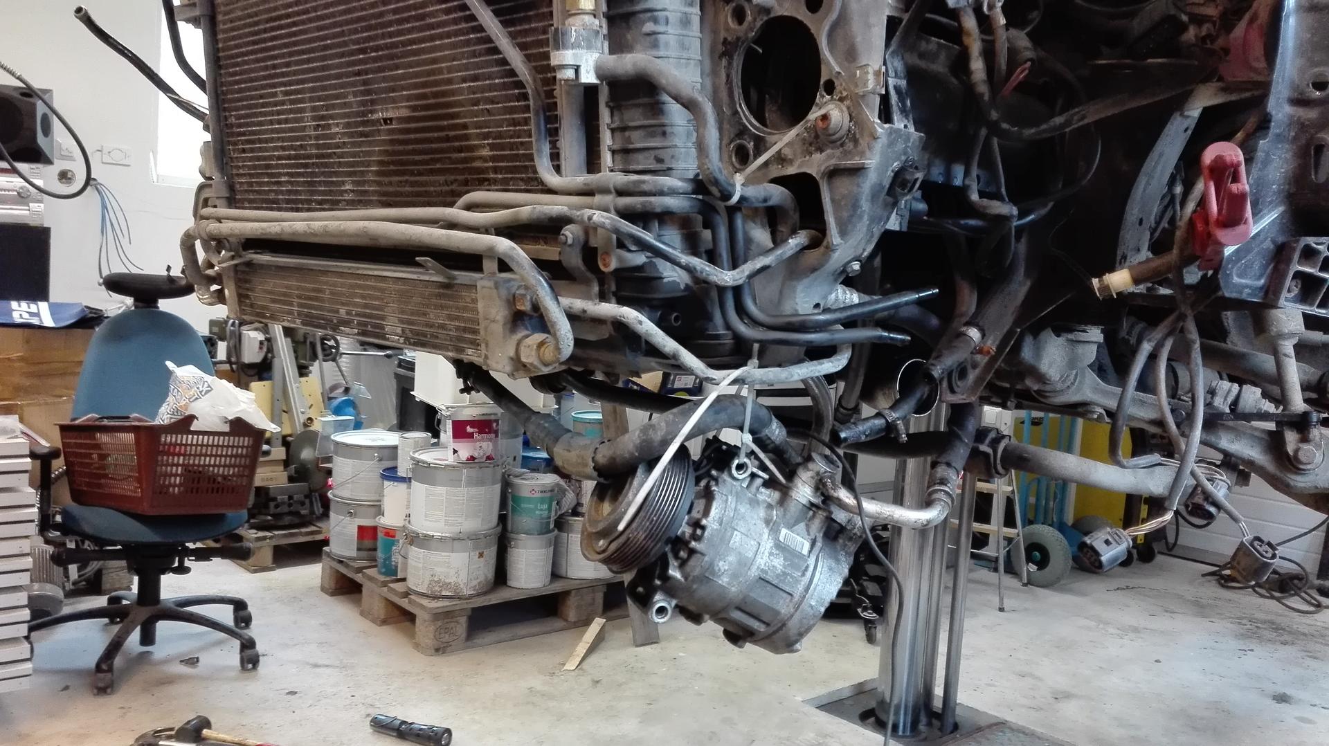 Ilmastoinnin kompura kannattaa ottaa irti moottorista. Ja lauhdutin irti jäähdyttimestä. Letkuihin ei kosketa, eli jätetään aineet sisälle. Kompura ja lauhdutin mahtuu olemaan letkujen varassa sivussa, kun tekniikan ottaa irti.