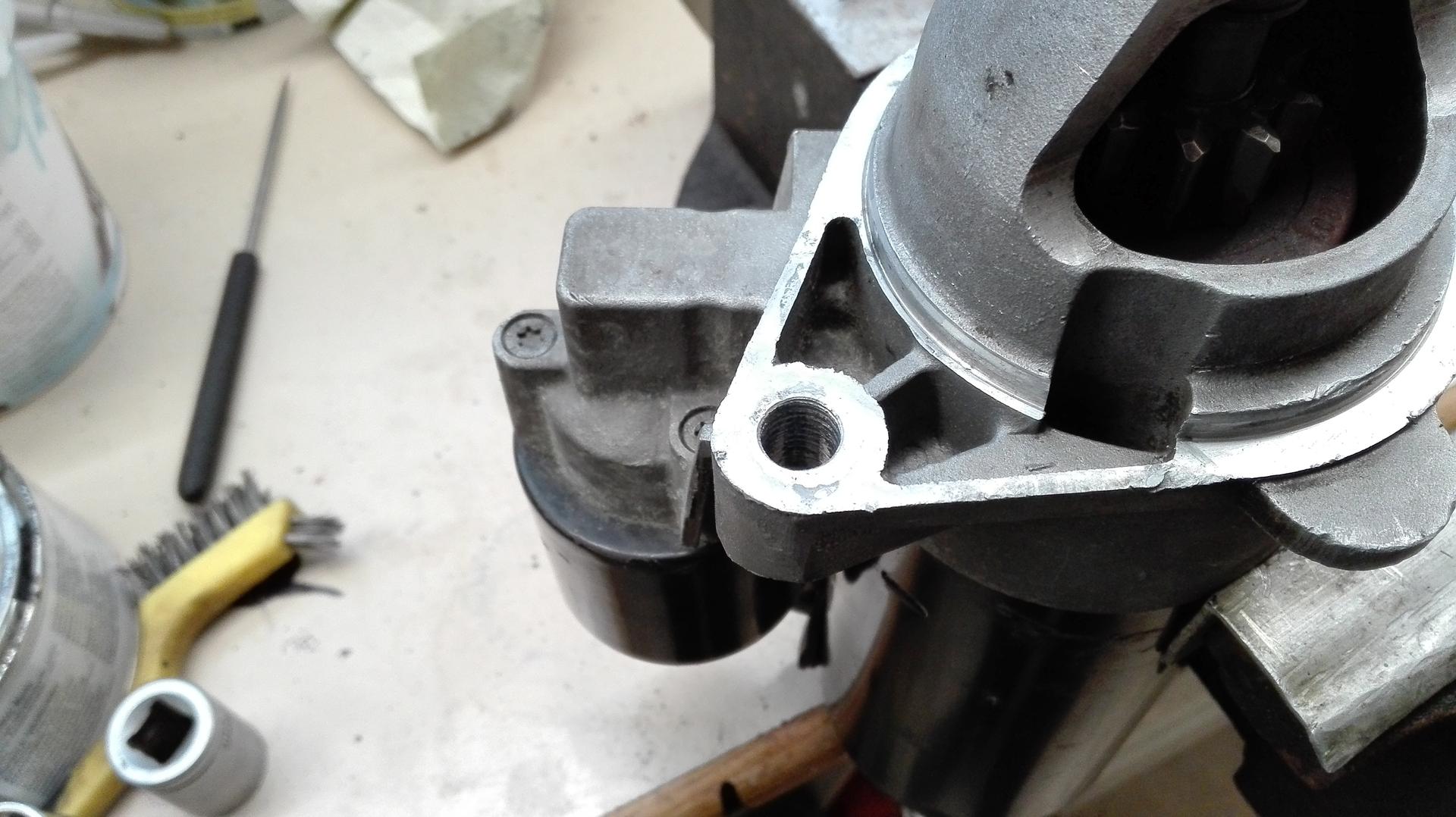 Startista oli toisen korvakkeen kierteet korkanneet täysin, on tainnut momentit olla kohdillaan edellisellä kiristäjällä toisen pultin tiukkuudesta päätellen. Tähän kokeilin helicoilia (tms). Helposti sai tehtyä uudet kierteet, kaippa se nyt kestää.
