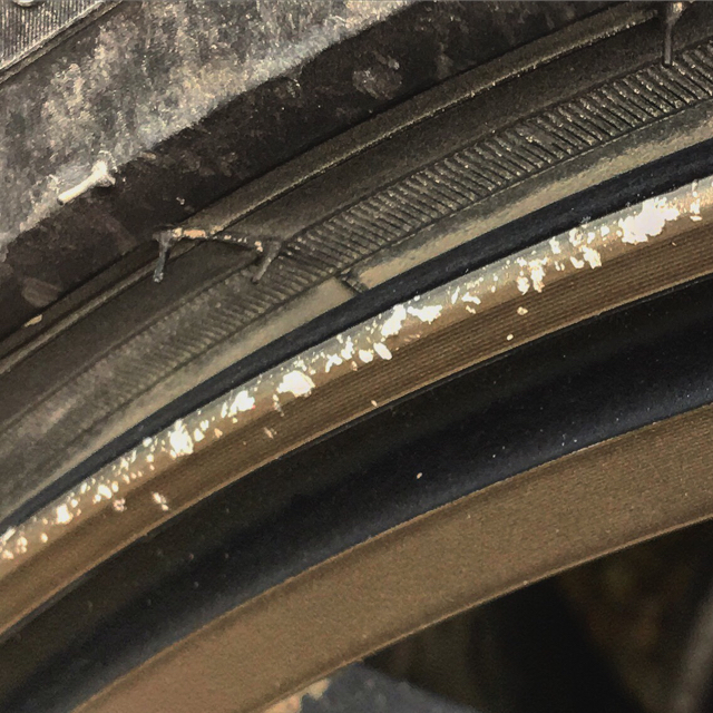 Perrierin vanteen hiekkatiellä ajettu ulkolaita näyttää miltä tahansa tämän päivän nykymuotivanteelta, jolla kevyt veny jättää vanteen ulkolaidan paljaaksi. On kyllä aika roisisti lähtenyt tuo lakkapinta aika kaukaa reunasta. Itse huomasin saman Rotan vanteilla (talvikäytössä!) ja olen nähnyt samaa myös Rohanan vanteissa ihan vähillä metreillä. Pinnat on tehty hienoiksi, ei kestäviksi, mikä on sääli. Perrier, vedä noi pulverilla yksiväriseksi ennen kun nakkaat nastat alle. Kestää varmasti parhaiten.
