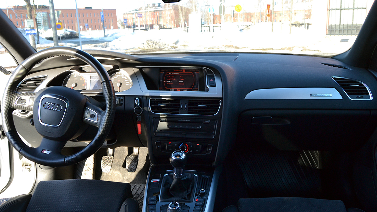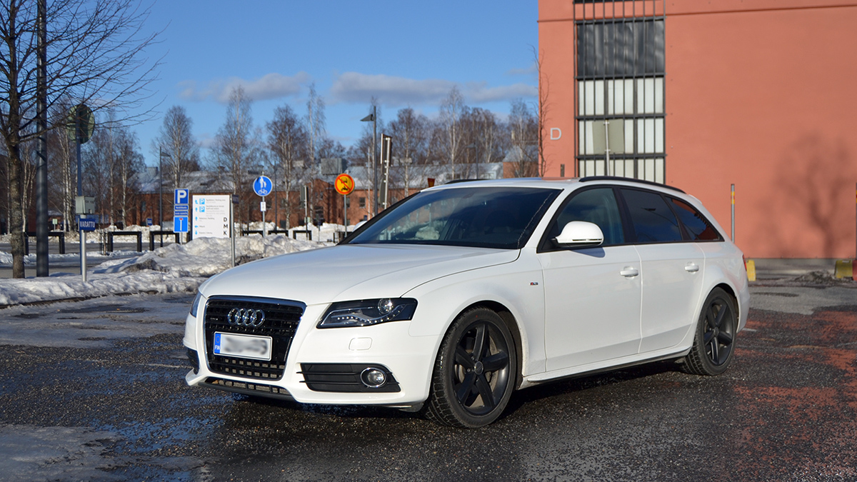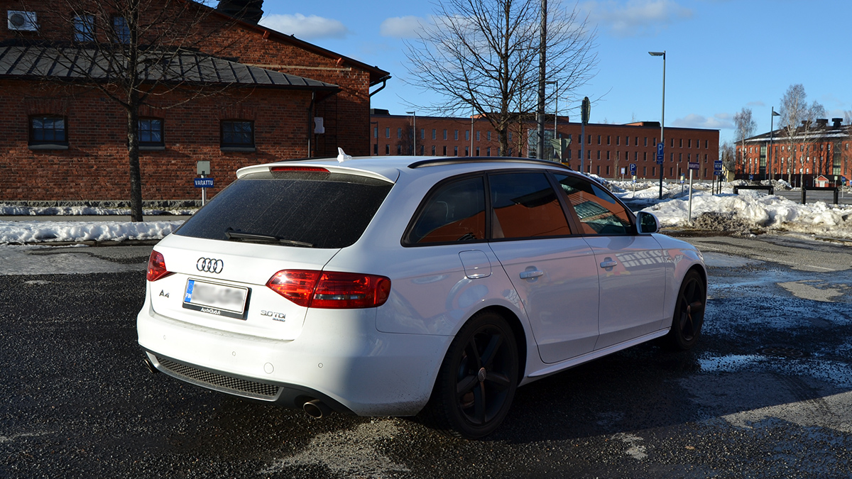 Eli siis kyseessä -09 A4 Avant 3.0TDI quattro 6v manuaalilla. Mittarissa on tällä hetkellä vähän päälle 170tkm. Autolla on aukoton huoltohistoria marmoriliikkeessä, joka heijastuu myös hyvään yleiseen kuntoon. Koneeseen on tehty imusarjanvaihtokamppanja, jonka lisäksi mm. lokasuojat on vaihdettu ja maalattu.