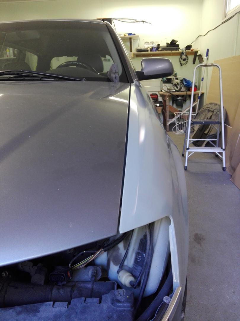Kairasin puskuriin tilaa tulevaa putkistoa varten, että saa putket suoraan ulos puskurista, Mallasin kohtia putkenpäillä ja nyt tällä asennuksella ainakin amispensseliteho kasvo 200heppaa :D Pitää vielä löytää sellaista kumista u-listaa jostain jolla saa viimesteltyä puskurin.