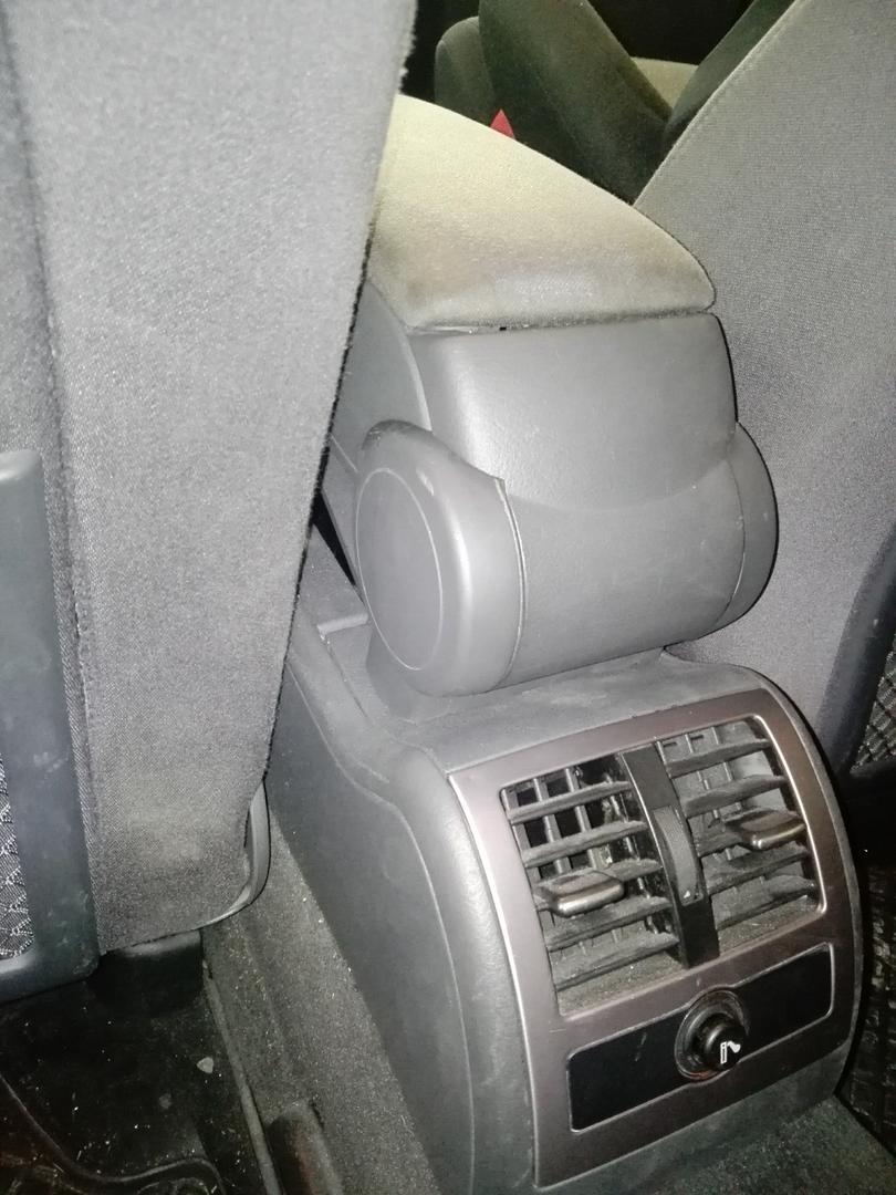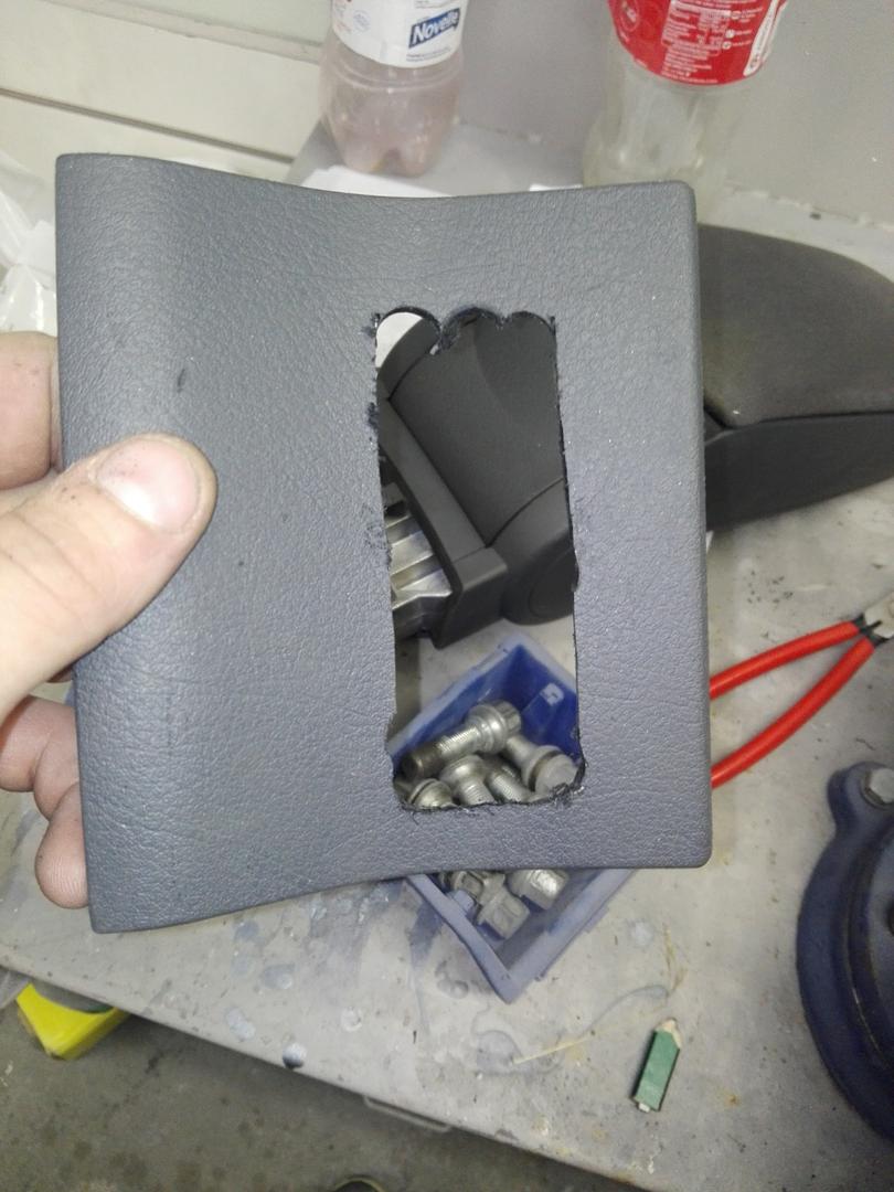 Ensiksi takatilan puhaltimen suulake pois. Lähtee helposti kun ottaa tupakansytyttimen pois ja sitten sormi tilalle ja kampeaa taaksepäin ja ylöspäin samalla. Kun otin sitten sen kansimuovin pois huomasin että keskikonsolin muovista saa valmiin reikämuotin piirrettyä kyynärnojan jalalle. Kansi takasi paikalleen ja alapuolelta kynällä merkit reijälle. Sitten ei muutaku jyrskäyttää reikä ja ruuvata kyynärnojan jalka ja itse kyynärnoja paikalleen.
