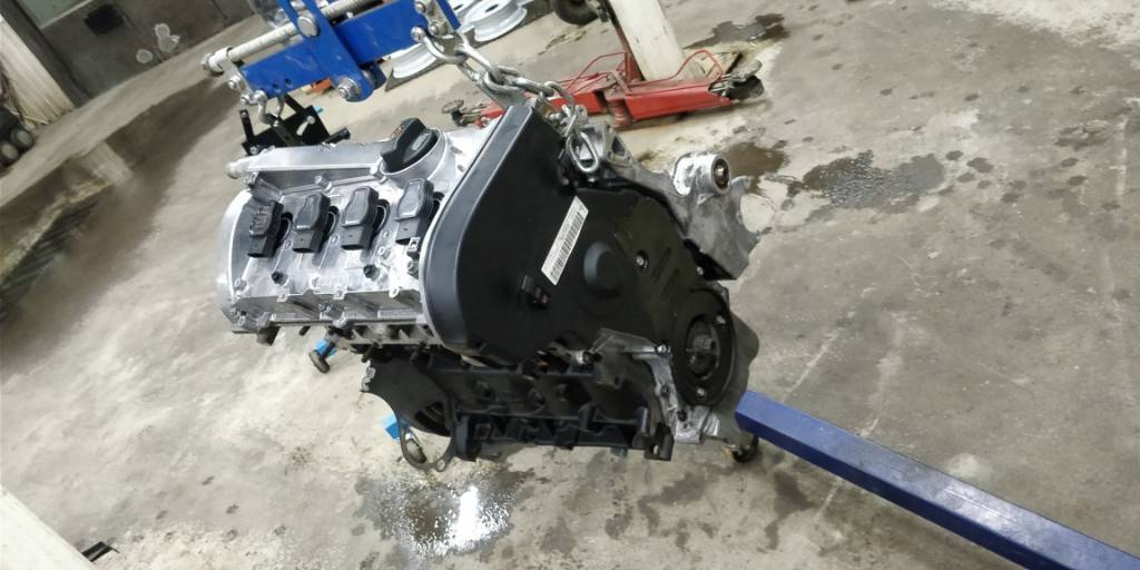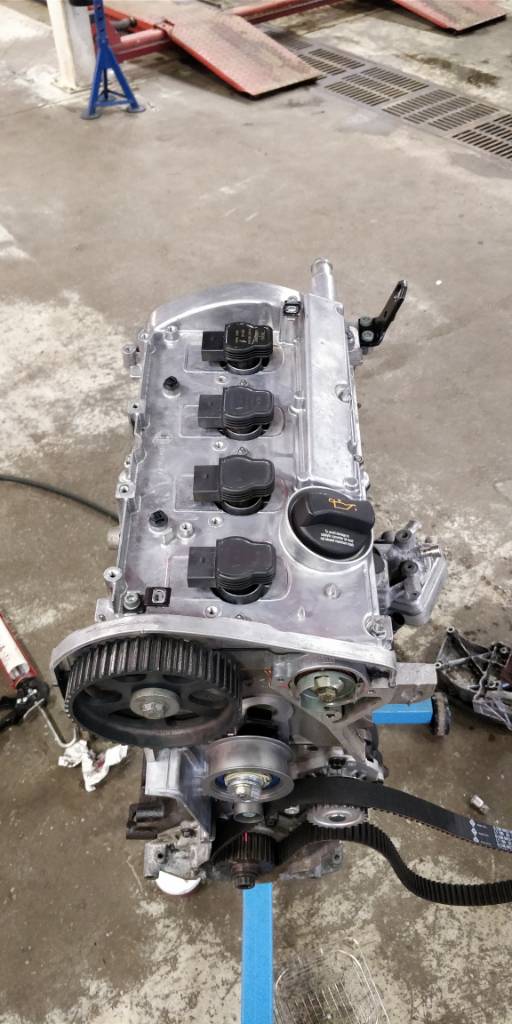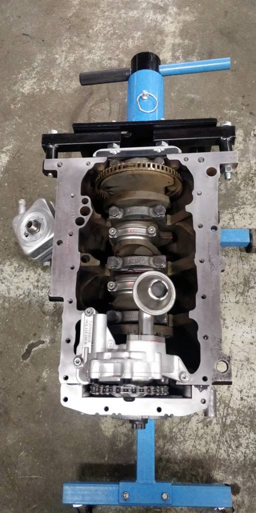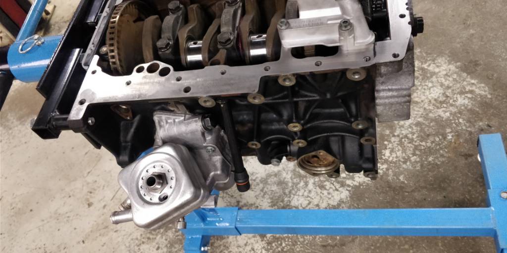 Paljon on taas tänään saatu aikaan, eli laakerit tuli laitettua alakertaan ja veivit momenttiin 67nm. Kansi päälle ja luonnollisesti uusilla pulteilla esitronic ohjeen mukaan 20nm, 40nm, 90 astetta ja lopukdi vielä toiset 90 astetta. Venttiilikoppa paikalleen ja tiivisteliimaa tarvittaviin kohtiin. Öljypohja tuli laitettua loctite 5900 tiivisteliimalla kiinni, josta hyviä kokemuksia ennestään. Moottori tuli siis asennuskuntoon ja se laitettiin konehuoneeseen. Moottorin mukana tulleet kannakekorvat kävi myös tähän b5 koriin, mutta keulan tukea joutuu vielä miettimään. AWT apulaitekannake sopi hienosti paikalleen ja apulaitteet meni myös paikalleen. Ongelma tuli kuitenkin alahihnapyörän kanssa, kun aeb pyörässä ei ole reiät kohdallaan ja "ET" on väärä apulaitteisiin nähden. Myös visko näyttäisi menevän muutaman millin liian syvälle.