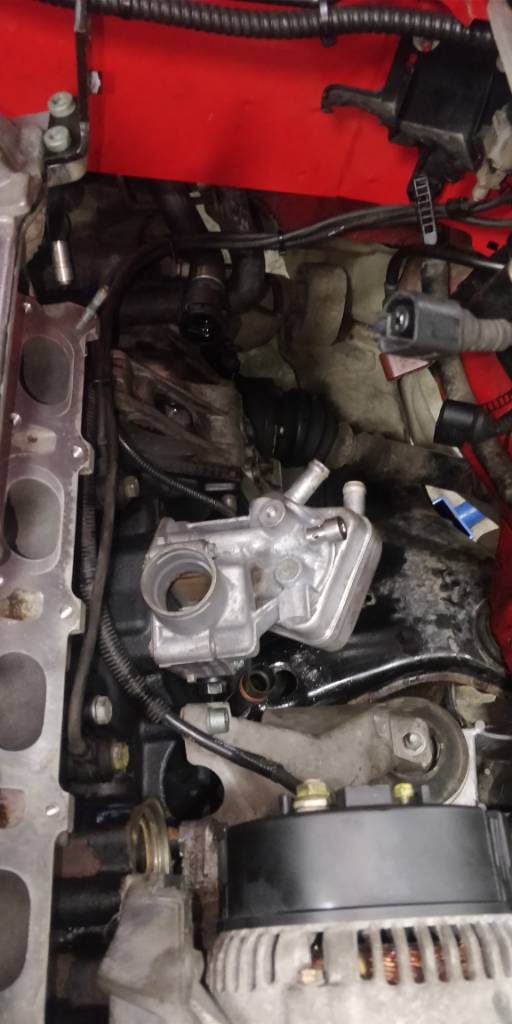 Alahihnapyörä tuli tosiaan AWT moottorista ja nyt saatiin moniurahihna paikalleen. Toki viskoa piti tuoda noin 4mm ulospäin prikoilla, että sekin saatiin muiden kanssa linjaan. Ilmastoinnin kompura kiristimineen on nyt kuitenkin yhden uran liian syvällä, joten tuo 4pk hihna ei tule toimimaan. Joko koitan 3pk hihnalla tai yritetään koneistaa kannakkeen reiät pitkiksi, että hihnapyörät saadaan linjaan. Samalla myyjällä kun sattui olemaan myös AWT imusarja, joten sekin vaihdettiin paikalleen samalla ja nyt shtoputkea ei tarvinnut enää pingottaa paikalleen. Samaten ylävesiputki, termostaatilta lämppärin kennolle lähtevä putki ja Termostaattikotelo tuli AWT moottorista. Vielä pitää hankkia AWT alavesiletku nykyisen kokkauksen tilalle.