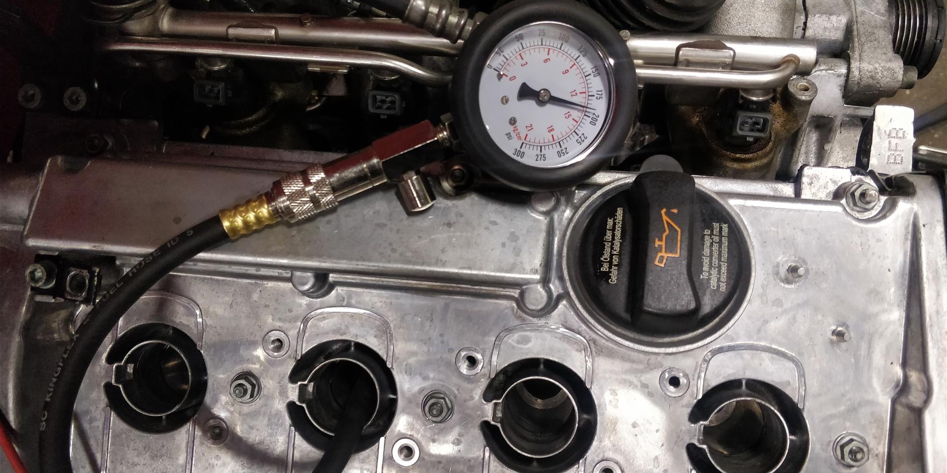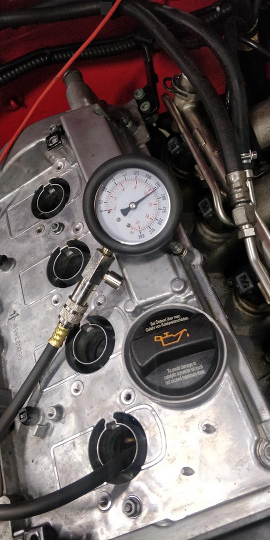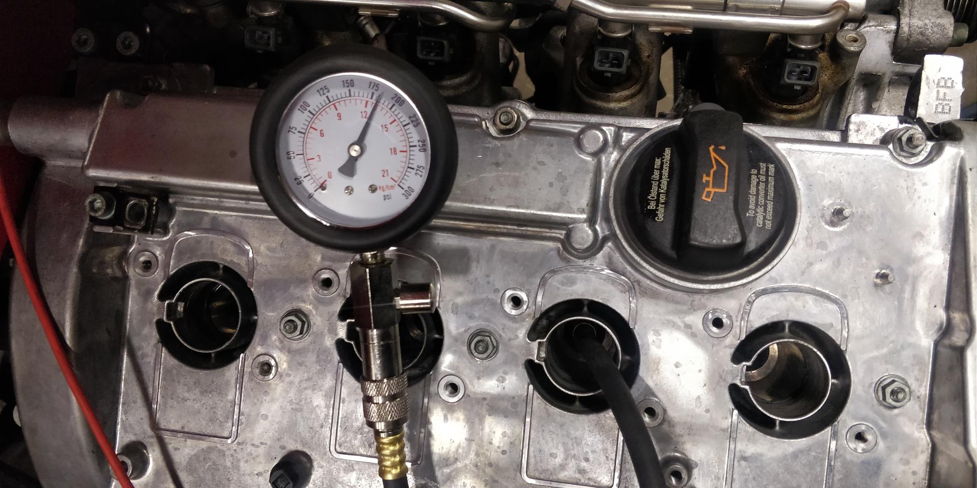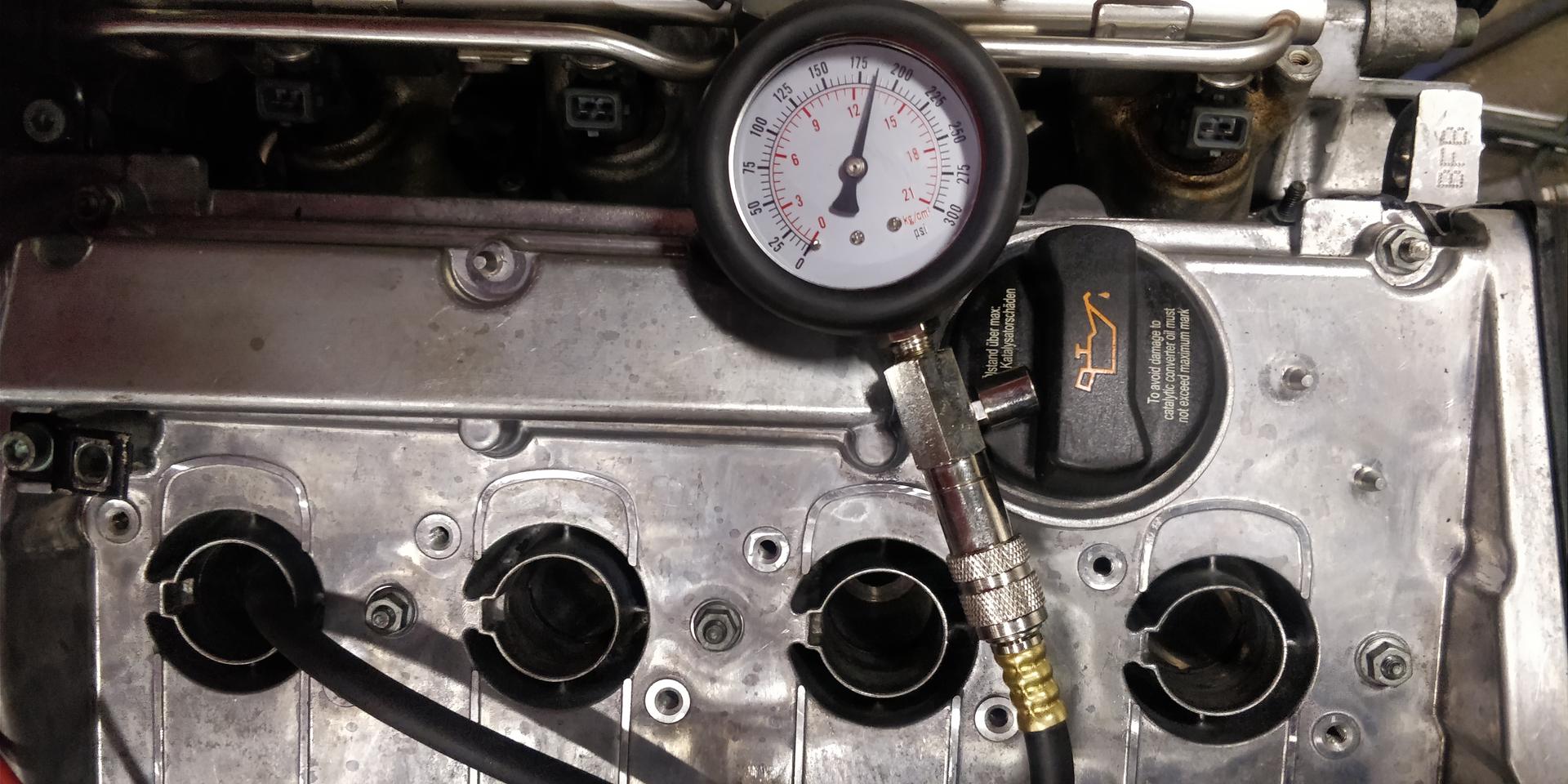 Auto tuli myös saatettua siihen kuntoon, että saatiin ottaa savut. Ennen käynnistämistä kuitenkin veivattiin startilla öljynpaineet koneeseen ja samalla siinä sitten tuli huvikseen mitattua puristuspaineet. Lukemat siis moottorista joka ei ole vielä käynyt pätkääkään. Startilla sai öljynpaineet vähän reiluun 2bariin ja käynnissä oli 4-4.5bar. Ensistartissa tuli muistettua, että se Perhanan reikä kannen takapäässä jäi tukkimatta ja sehän sitte pörisi aika kivasti sieltä. Sain sinne kuitenkin m12 kierteen tehtyä konehuoneeseen päin, joten eipä sekään nyt niin valtavaksi ongelmaksi muodostunut.