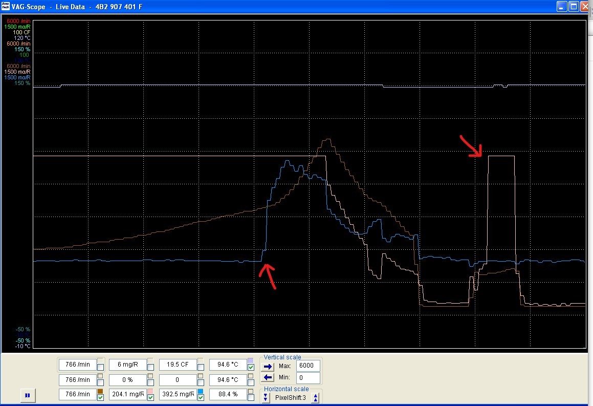 Tässä on logitettuna yksi kiihdytys, jossa ensin on vika päällä, mutta sitten MAFin measured ilmamäärä hyppää kohti tavoitetta. SItten vika tulee taas päälle. EGR on tulpattu ja se vaikuttaa tuohon toteutuneeseen pienillä kierroksilla.