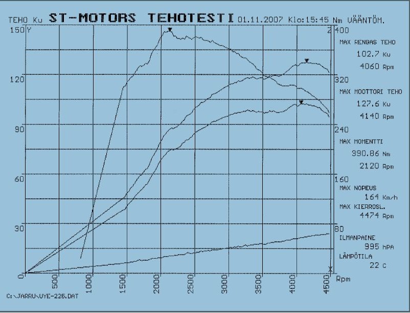 No nyt on lastutus suoritettu. Laitettiin hieman customoitu ohjelma. Tuloksena noin 170 heppaa ja noin 360-370Nm vääntöä. Kevennettiin hieman alavääntöä, jotta kytkin ei rasittuisi liikaa. Vääntö alkaa jostakin 1200 kierroksen nurkilta. Hyvältä vaikuttaa näin lyhyen testin eli reilun 100km ajon jälkeen.