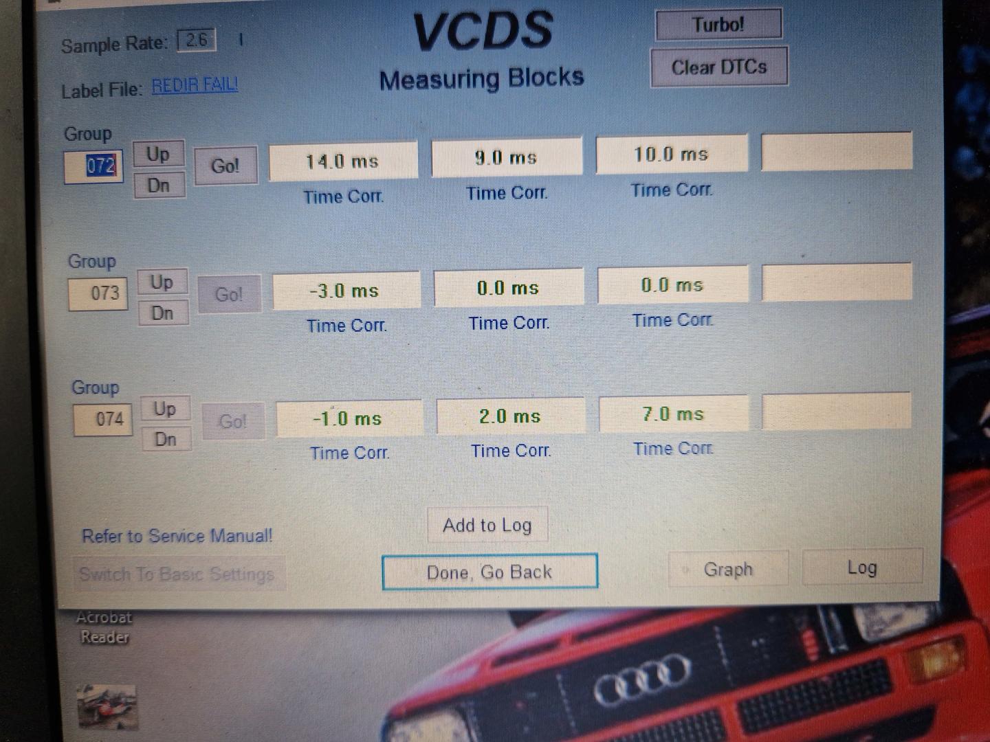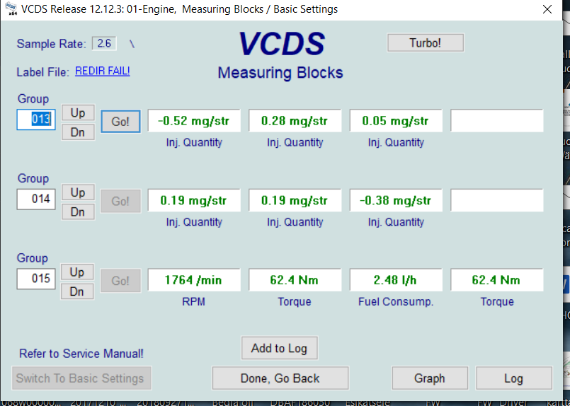 VCDS:llä ruiskutusmäärät ja korjausarvot seuraavanlaiset