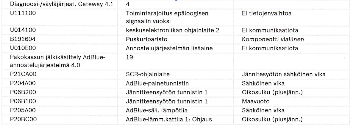 - P20C400, reduktioaineiden lämmityksen 3 ohjaus: oikosulku plussaan. Tämä vika on kahdesti niin moottori- kuin reduktioainejärjestelmässä.