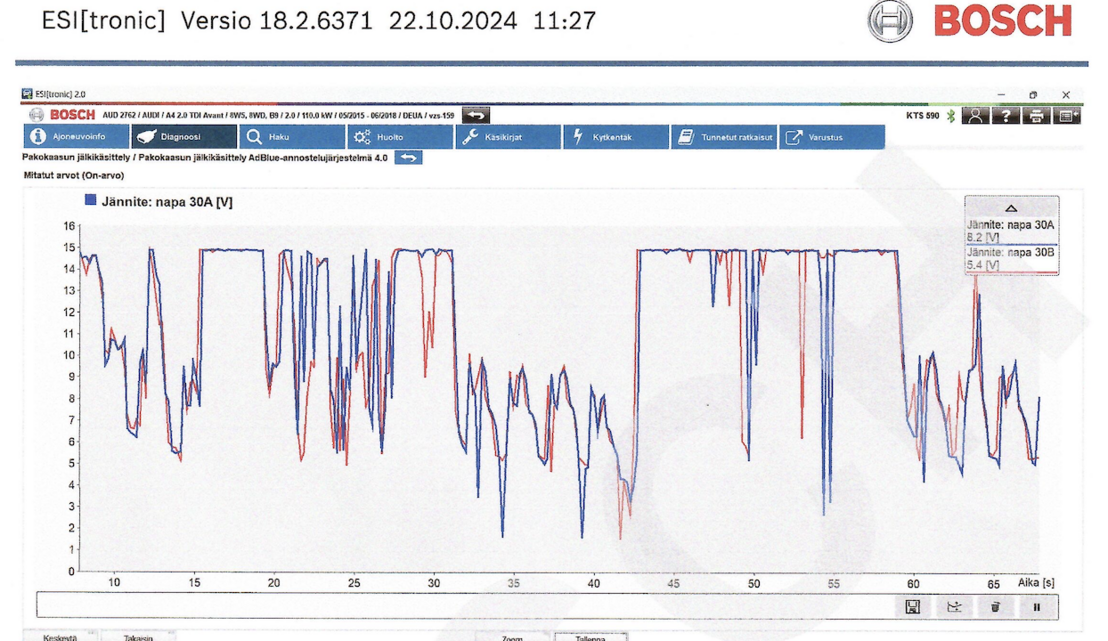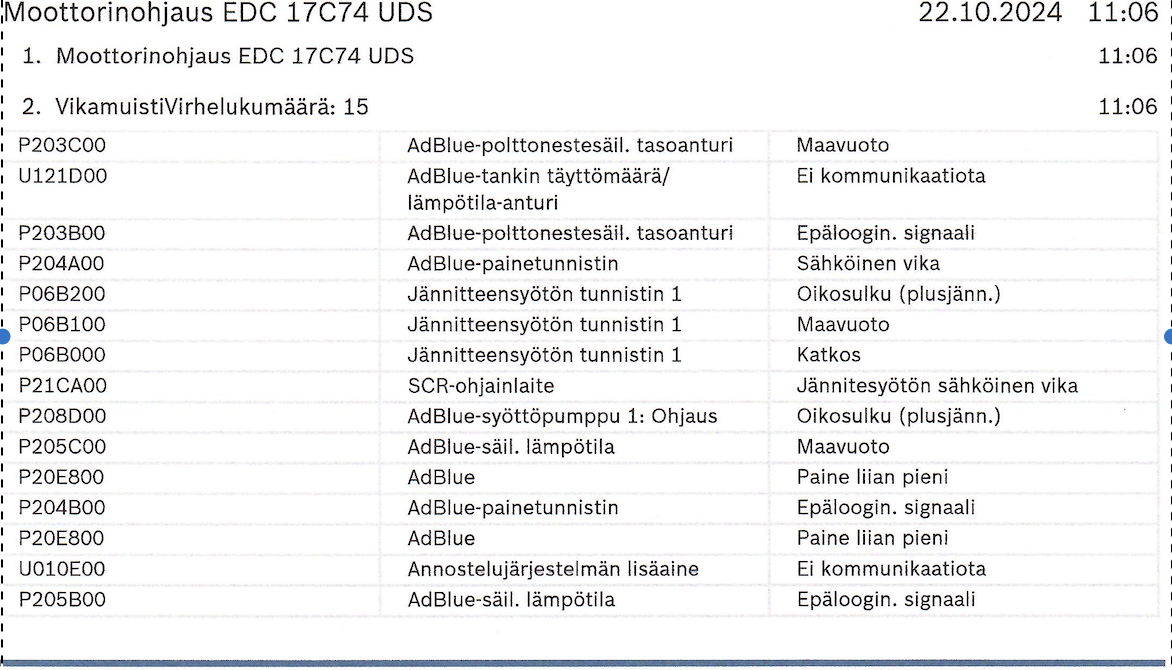 2018 Audi A4 Avant TDI 2.0 (177 Tkm) tuli myös tuo kehotus korjaamolle AdBlue ongelman takia. Käytin testauksessa ja tulokset alla. Myyjäliike tulee mukaan kustannuksiin, eli tilaa jostain käytetyt osat (voihan kele). Auto ollut käytössä reilun kuukauden ja ajanut sillä vajaa 3t km. Korjaamosta arvio 3.3 t€ niin parempi kuitenkin saada myyjäliikkeen kanssa sovittua. Menisi siis tankki , pumppi ja ohjain uusiksi. Jotenkin haluaisi vielä uskoa että joko liittimet tai ohjain olisi vaan rikki mutta... Onko kellään parempaa tietoa noista tuloksista kertoa onko tosiaan kaikki uusittava?
