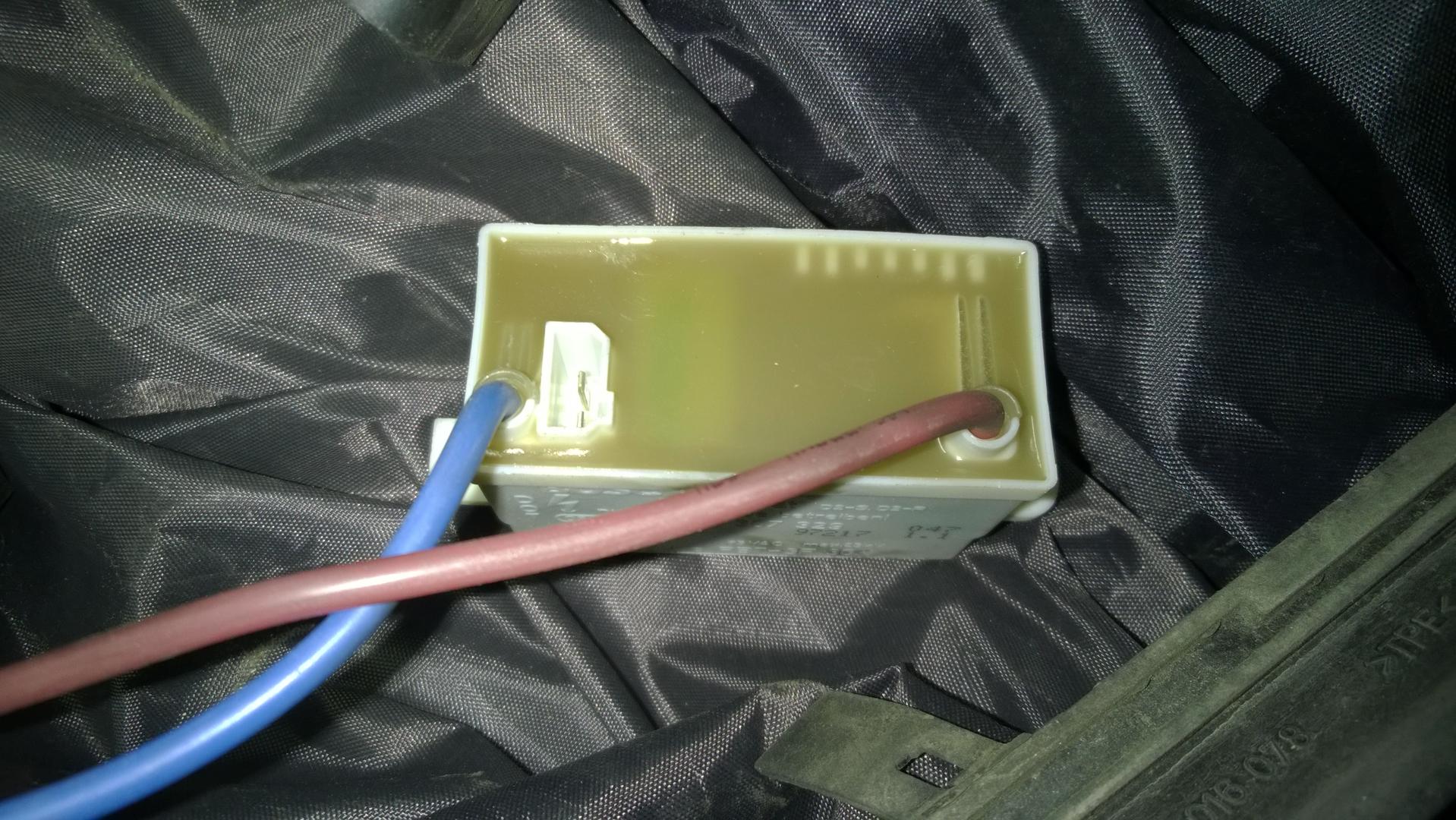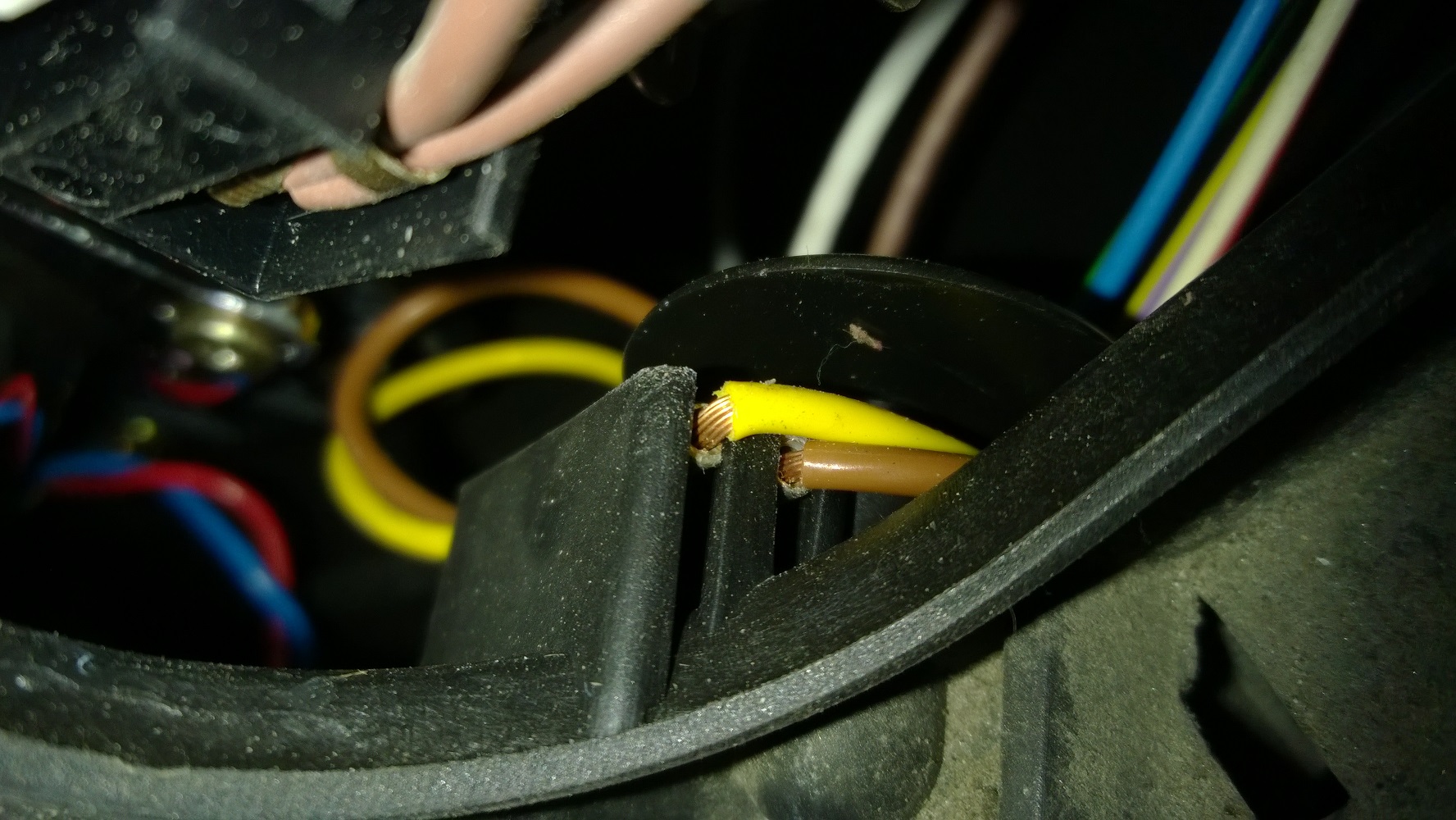 Ajovalon sisuksia tarkastellessani havaitsin lisäksi kotelon sisällä kulkevien johtojen eristyksissä vikaa (ruskean ja keltaisen johdon eriste rikki).