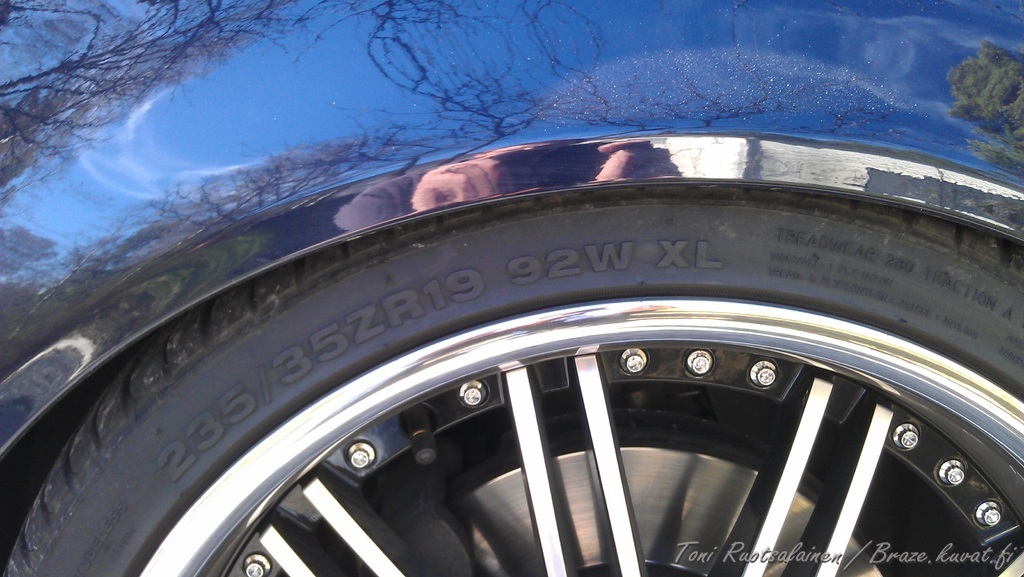 • Skuutti: Itse tosin haluaisin just tuon pari senttiä kaaraa ylemmäksi. Sulla on vissiin about 255/40x17" tuossa kuvassa alla? Tuokin näyttäisi jo riittävän matalalta jos laitat "täytettä" kaariin. Mullahan pyörii kesällä nuo 255/35x19" joka on halkaisijaltaan isompi.