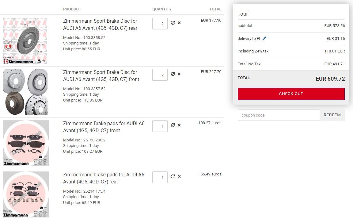 MKS Autoteile on esim. etulevyt kympin halvemmat kuin Zimmermann Bremsetechnikissä sekä toimituskulut kympin halvemmat. Isommalla setillä isommin säästöä.