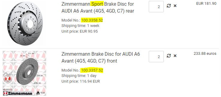 - ovatko Zimmermannin 100.3358.52 (taakse) ja 100.3357.52 (eteen) niitä rei'itettyjä, hyviä Sport Coat Z:ja? Hämää Zimmermannin sivuilla tuotteen nimi. Vain toinen on merkitty Sportiksi (ks. kuva alla). Lisäksi tuo takajarrulevyn kuva on ilmeisesti väärä, kun kaikkialla muualla näyttää eriltä. Kuvassa lienee Formulta:Z-levy (?).