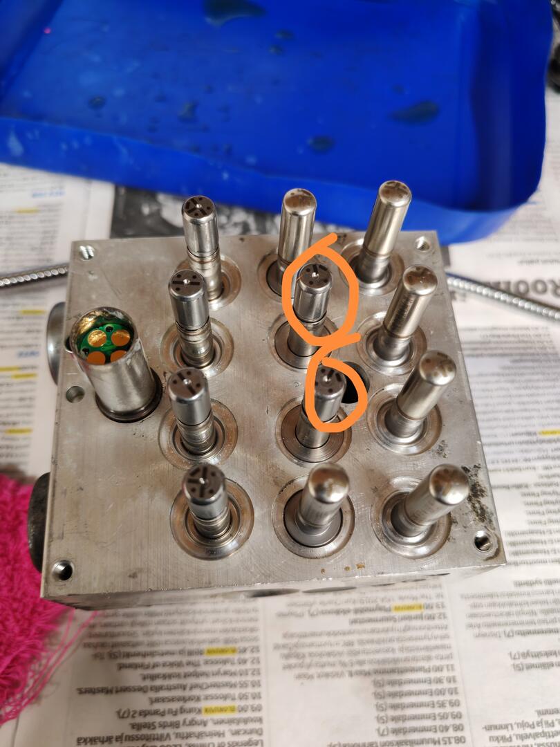 Otin abs yksikön irti ja totesin että keskimmäisen rivin venttiilit ovat jumissa. Reunimmaiset totteli lämpöä ja liottamista, mutta keskimmäiset ovat jumissa. Magneetilla testannut venttiilien liikkuvuutta.